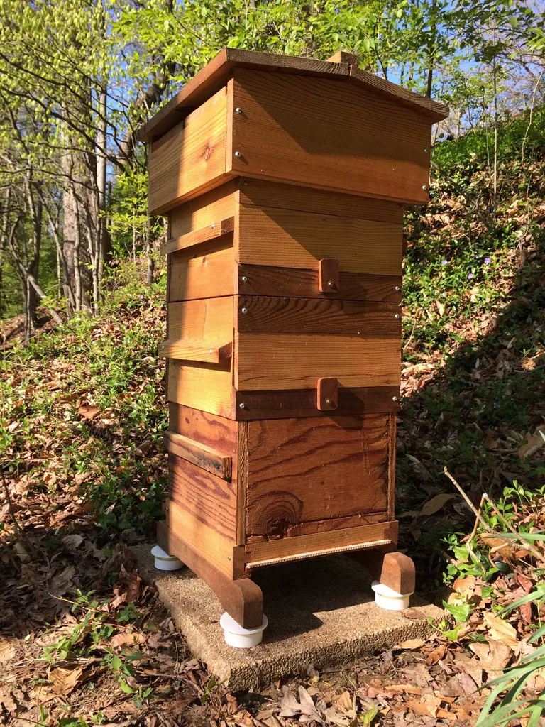 Nếu bạn muốn gắn cố định, mỗi chân chỉ cần 1 con vít và vòng đệm để cố định qua lỗ ở giữa và vào phần gỗ của chân đế. Sau khi cân chỉnh tổ ong, bạn có thể đổ nước, dầu hoặc chất lỏng khác vào phần rãnh của chân. Điều này sẽ ngăn kiến và các loại côn trùng bò khác bò lên tổ. Bạn cần kiểm tra định kỳ để đảm bảo không có gì vắt ngang qua rãnh hoặc kiến đã hy sinh làm cầu nối cho cả đàn.