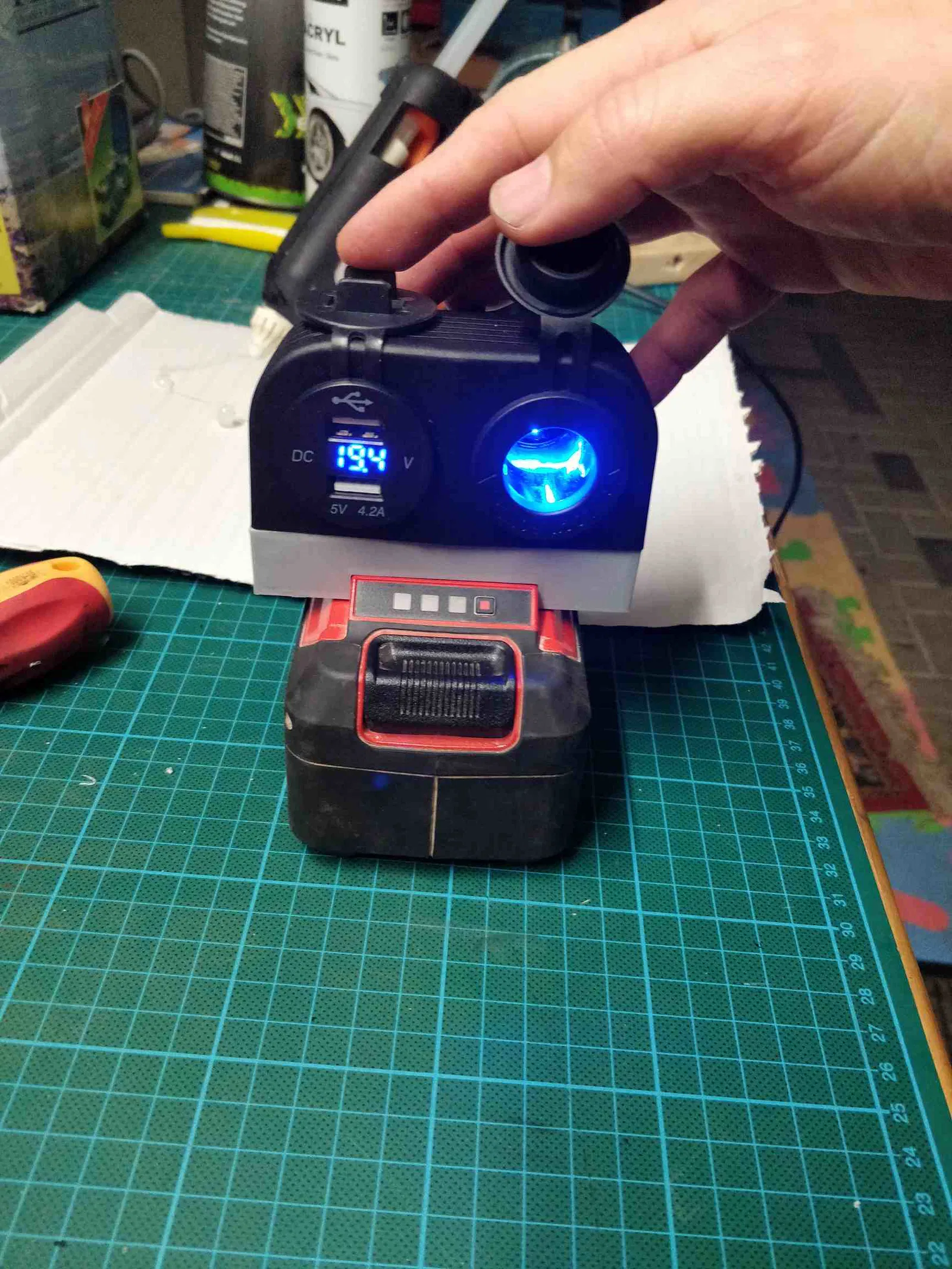 Tấm đế chuyển đổi Einhell 18V Power X-Change sang cổng sạc USB/Tẩu thuốc 12V. Dùng để kết nối pin Einhell 18V với các thiết bị 12V. In đứng, không cần hỗ trợ. Link mua phụ kiện 12V và blog chi tiết có sẵn.