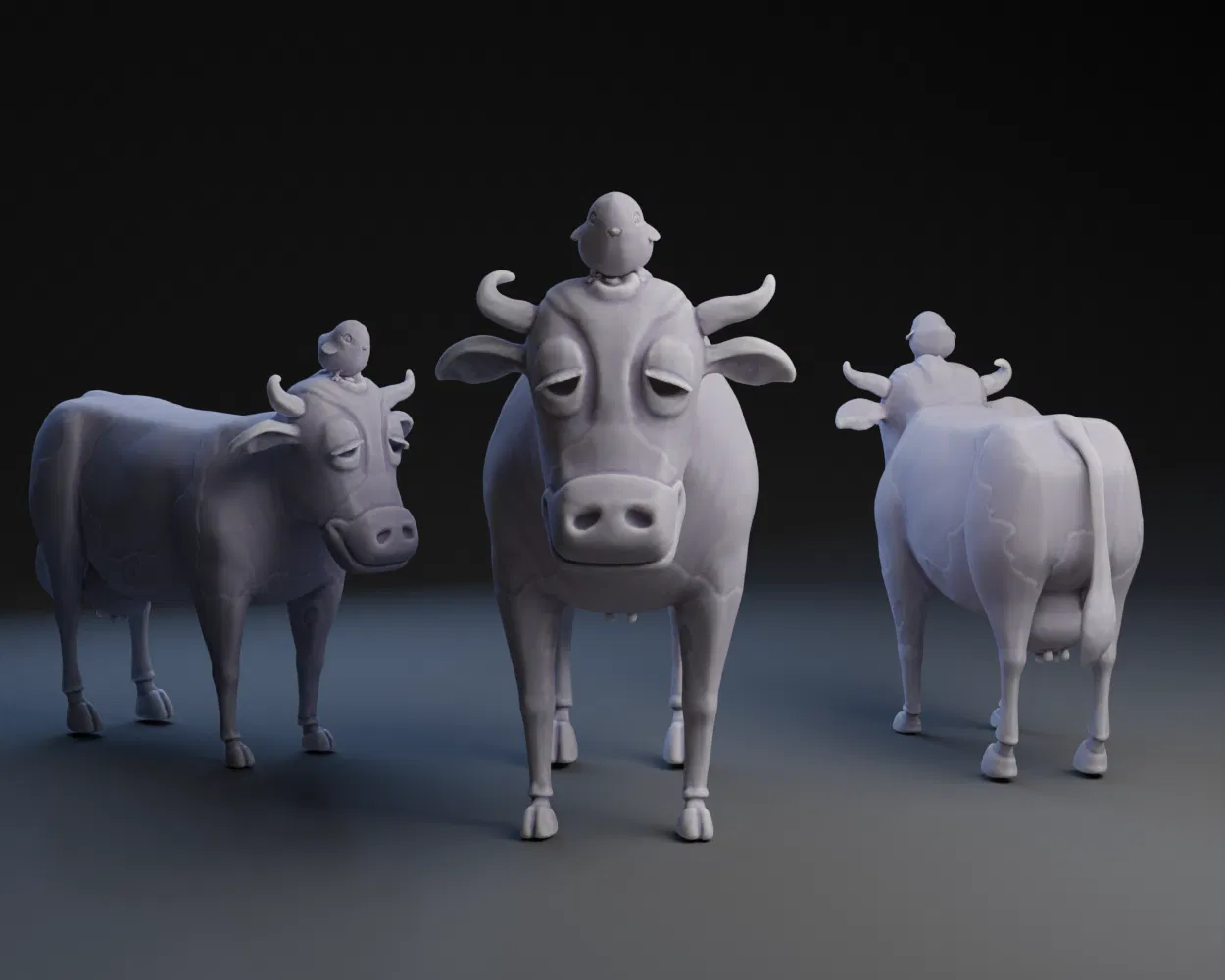 Mô hình 3D "Bò và Gà Con" khắc họa hình ảnh một chú bò hiền lành đang ấp ủ một chú gà con bé bỏng trên đầu, tạo nên một khung cảnh ấm áp và đáng yêu, thích hợp cho các dự án in 3D về động vật, nông trại.