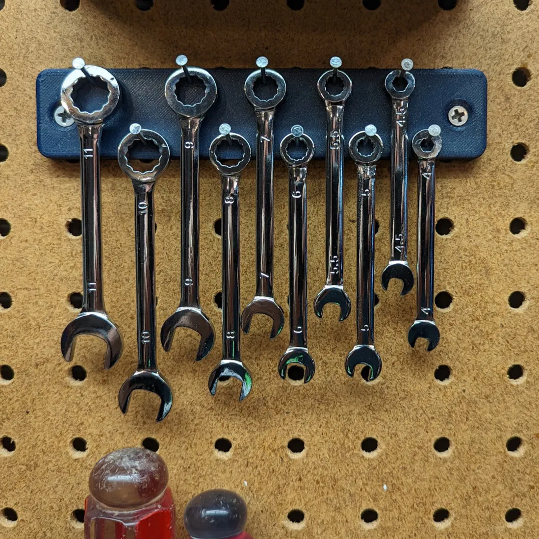 Giá đỡ cờ lê SpeedWox sử dụng ốc vít nhỏ làm chốt. Ốc vít này có đường kính khoảng 1,4mm và chỉ cần đóng vào là được. Gắn vào pegboard bằng vài con vít.