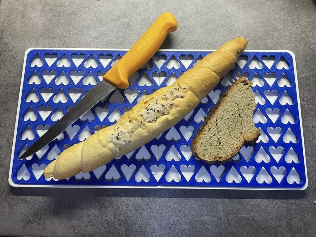 Thiết kế thớt cắt bánh mì hình trái tim độc đáo, giúp bạn dễ dàng cắt bánh mì, baguette và hứng vụn bánh mì rơi xuống. Sản phẩm in 3D đơn giản, hữu ích cho nhà bếp.