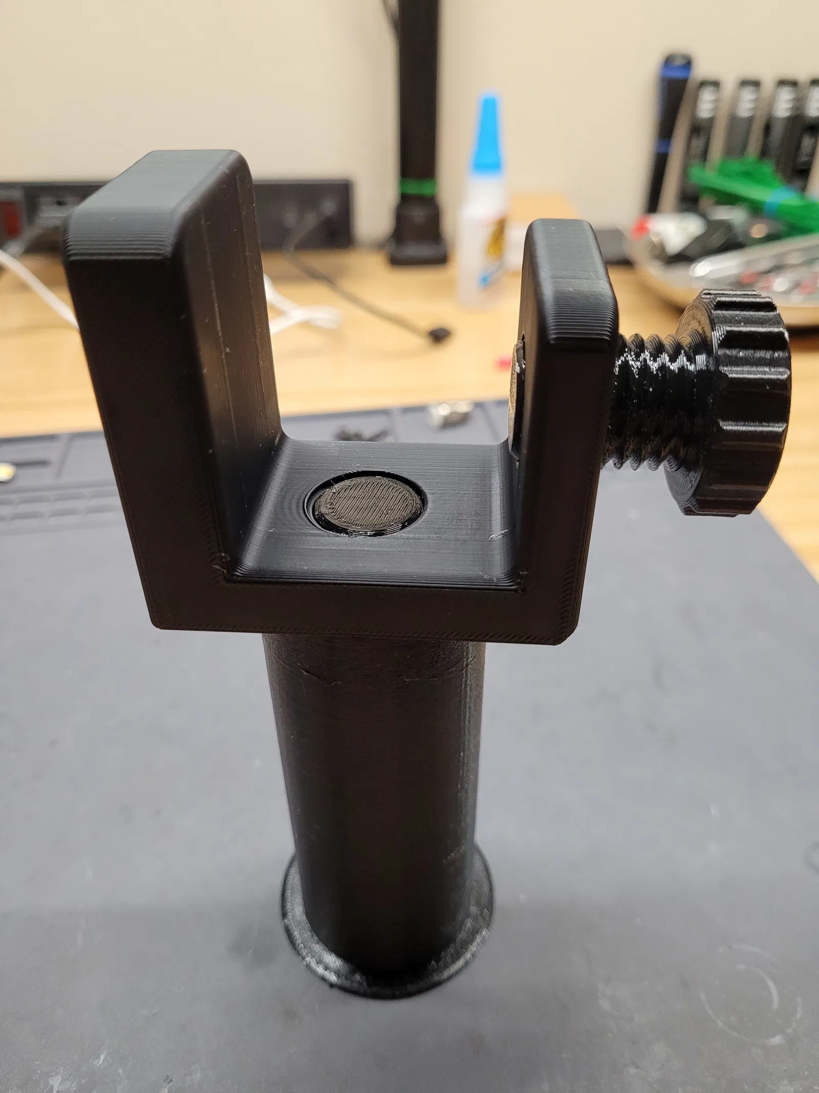 Mô hình đơn giản cho phép bạn gắn giá đỡ cuộn dây (spool holder) vào bàn bằng một con vít vặn tay (thumbscrew). Mình hay xài cái này khi nối hai cuộn dây tóc lại với nhau, nó giúp thao tác dễ hơn và chuyển cuộn dây nhỏ sang cuộn dây kia.