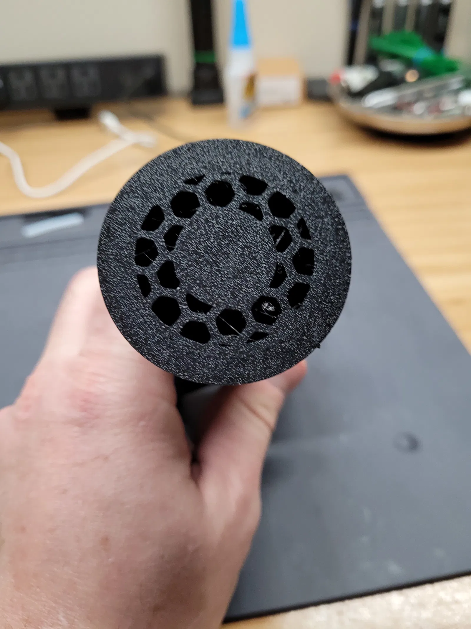 Mình có để kèm hai loại giá đỡ cuộn dây. Loại hình lục giác nhìn đẹp hơn chút nhưng in lâu hơn. Loại thường thì xài cũng ok nhưng in nhanh hơn. Mình khuyên dùng PTEG cho mấy cái này, vì bạn cần độ bám dính giữa các lớp thật tốt để tránh nguy cơ bị gãy cái đầu có ren. Tuy nhiên, PLA cũng xài được nếu bí lắm.