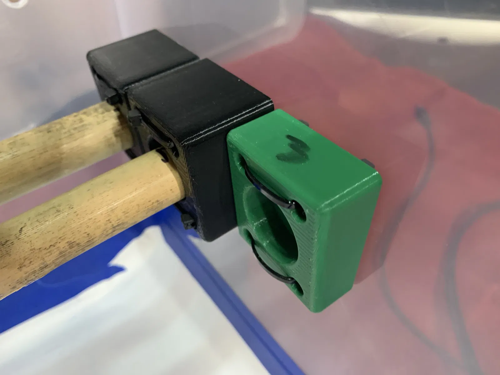 Độ cao lớp in là .30 và tốc độ in 150%. Tui dùng mỏ hàn để đốt lỗ trên thùng, rồi xỏ dây rút nhựa vô để cố định bracket, sau đó cắt tre cho vừa. Mấy cái bracket này dày hơn ½ inch, tới giờ xài vẫn ngon lành!