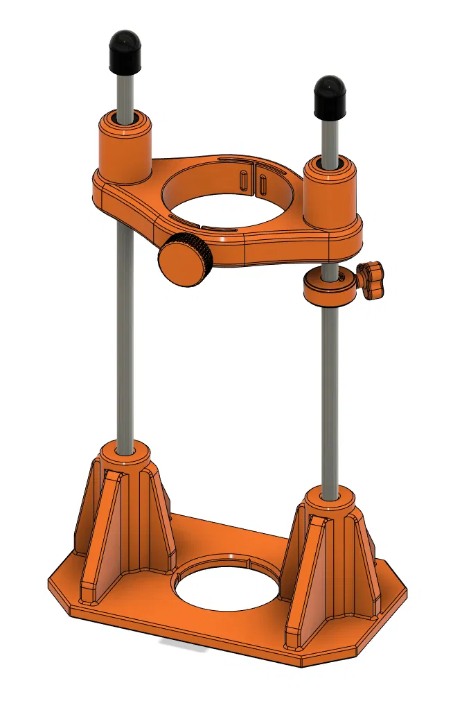 Cái này là cái đế khoan cho máy Bosch GSB/R 18V-110c hoặc mấy máy tương tự có đường kính 62mm. Bạn cần 2 thanh trượt tuyến tính 8mm x 300-350mm, 2 bạc đạn LM8LUU, và 1 lò xo nén.
