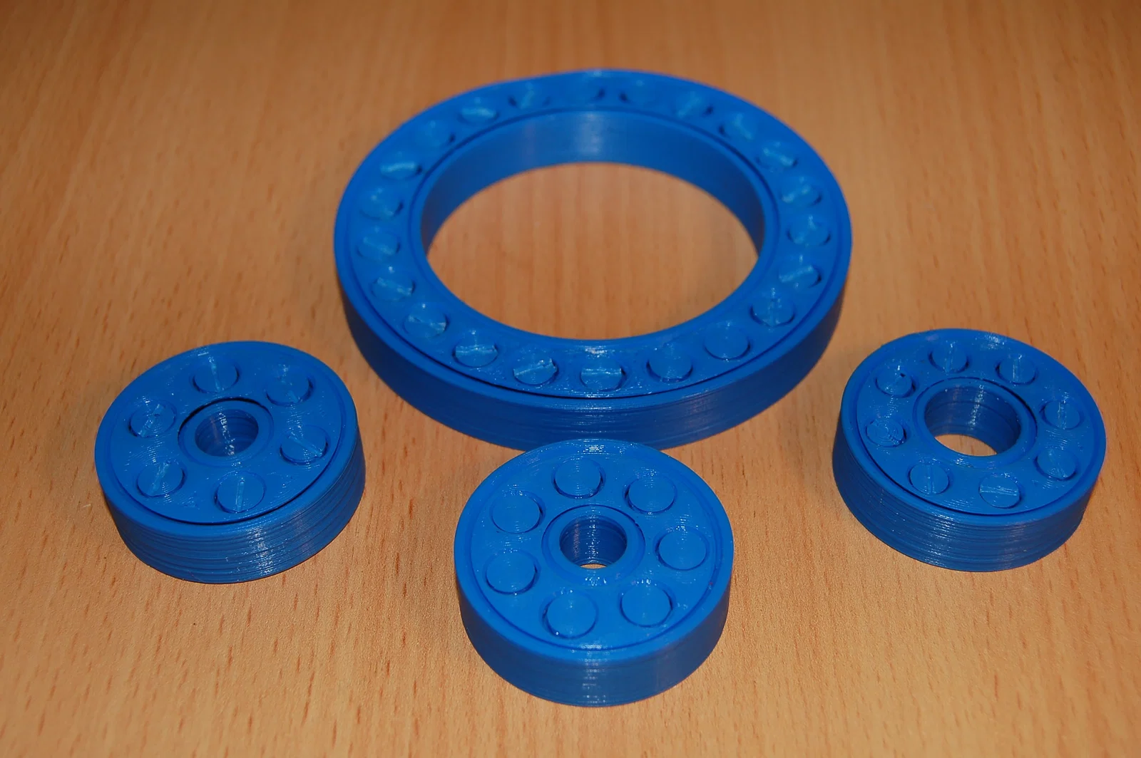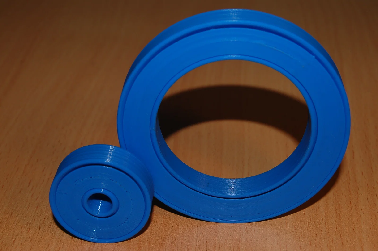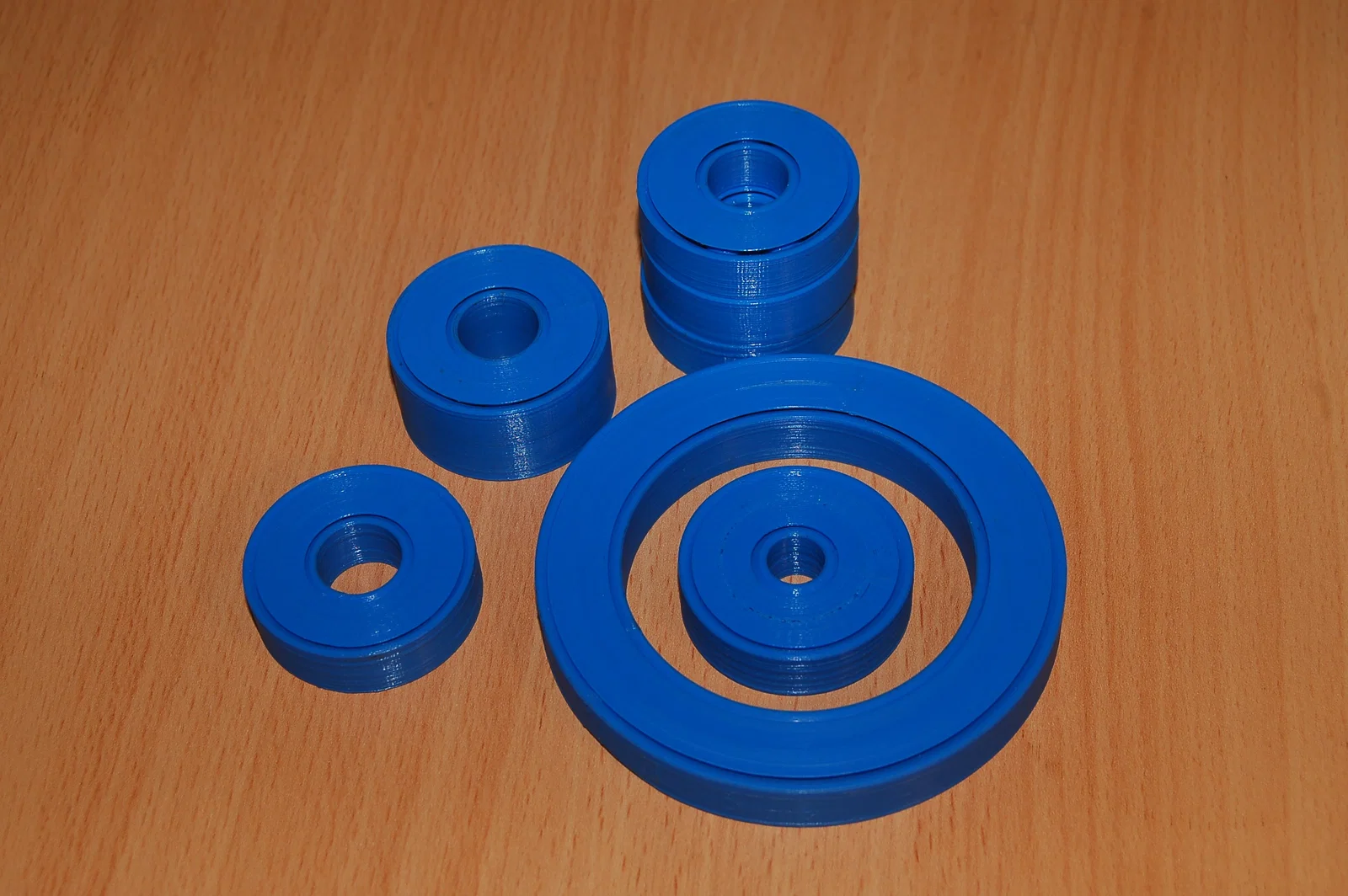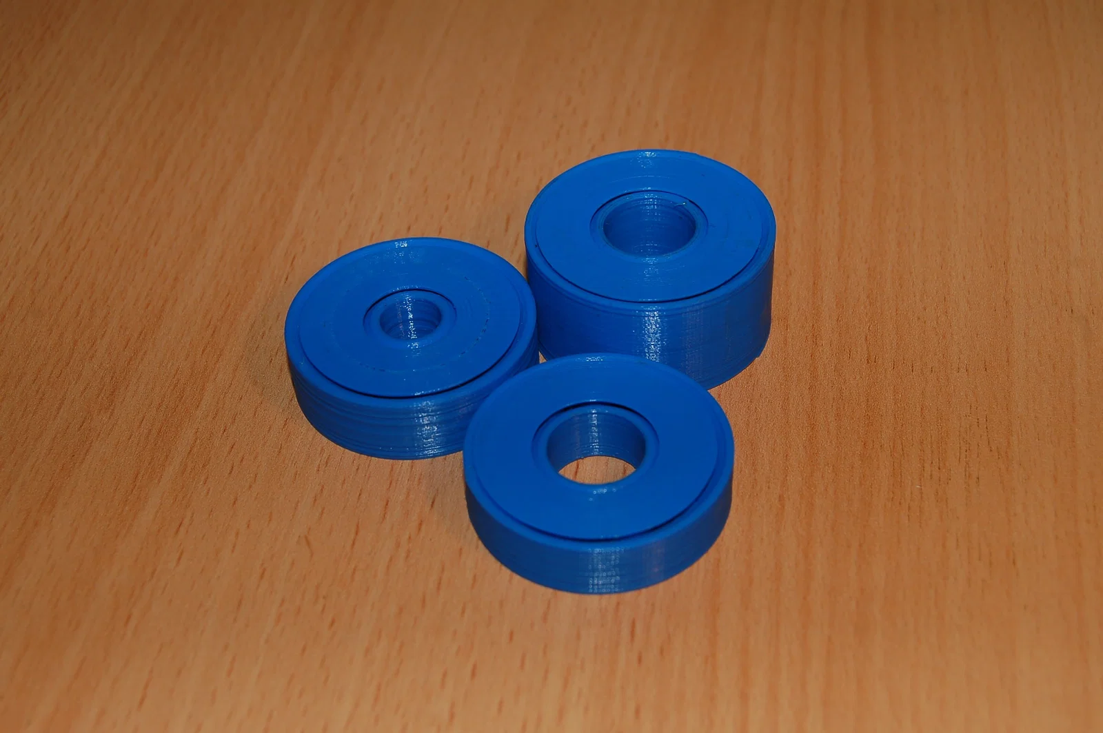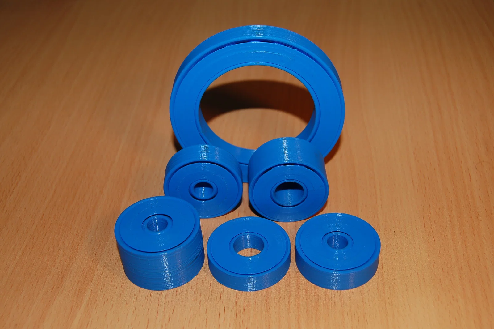 Bạn cũng có thể tạo các tệp STL riêng biệt cho các phần khác nhau của vòng bi (đường lăn, con lăn và lồng) để bạn có thể làm vòng bi đa vật liệu. Nói chung, tôi khuyên dùng vật liệu cứng cho con lăn và đường lăn; PLA thực sự khá tốt về mặt này. Được làm hoàn toàn từ PLA (như tất cả các ví dụ), chúng hoạt động tốt. Thêm một chút chất bôi trơn silicon giúp chúng hoạt động tốt hơn.