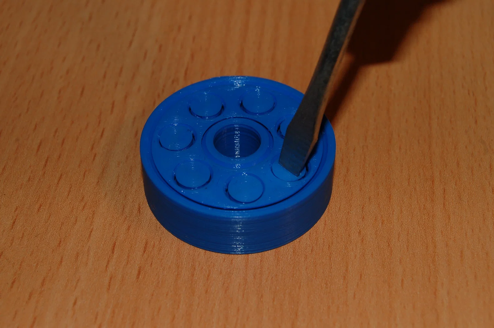 Tôi đã thêm các rãnh vào đáy của các con lăn, vì vậy chúng có thể được nới lỏng bằng tuốc nơ vít đầu phẳng nếu cần; nói chung, điều này không cần thiết nếu cài đặt in của bạn tốt, nhưng vẫn hữu ích. Các rãnh nới lỏng có thể được đặt vào con lăn một chút để lớp đầu tiên che phủ toàn bộ đáy con lăn, bao gồm cả các rãnh nới lỏng. Khá dễ dàng để ép xuyên qua lớp đầu tiên mỏng này như trong hình.