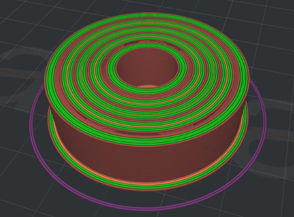 Bạn sẽ cần kiểm tra trong bộ cắt của mình, rằng lớp bắc cầu đầu tiên trên các con lăn chỉ bao gồm các vòng tròn đồng tâm bắt đầu và dừng trên các trụ lồng. Bạn sẽ cần đặt số lượng vỏ đủ cao để điều này hoạt động; sử dụng tính năng 'cage slice' sẽ giảm số lượng vỏ cần thiết cho việc này. Điều này đảm bảo rằng các con lăn được bắc cầu sạch sẽ trong quá trình in.