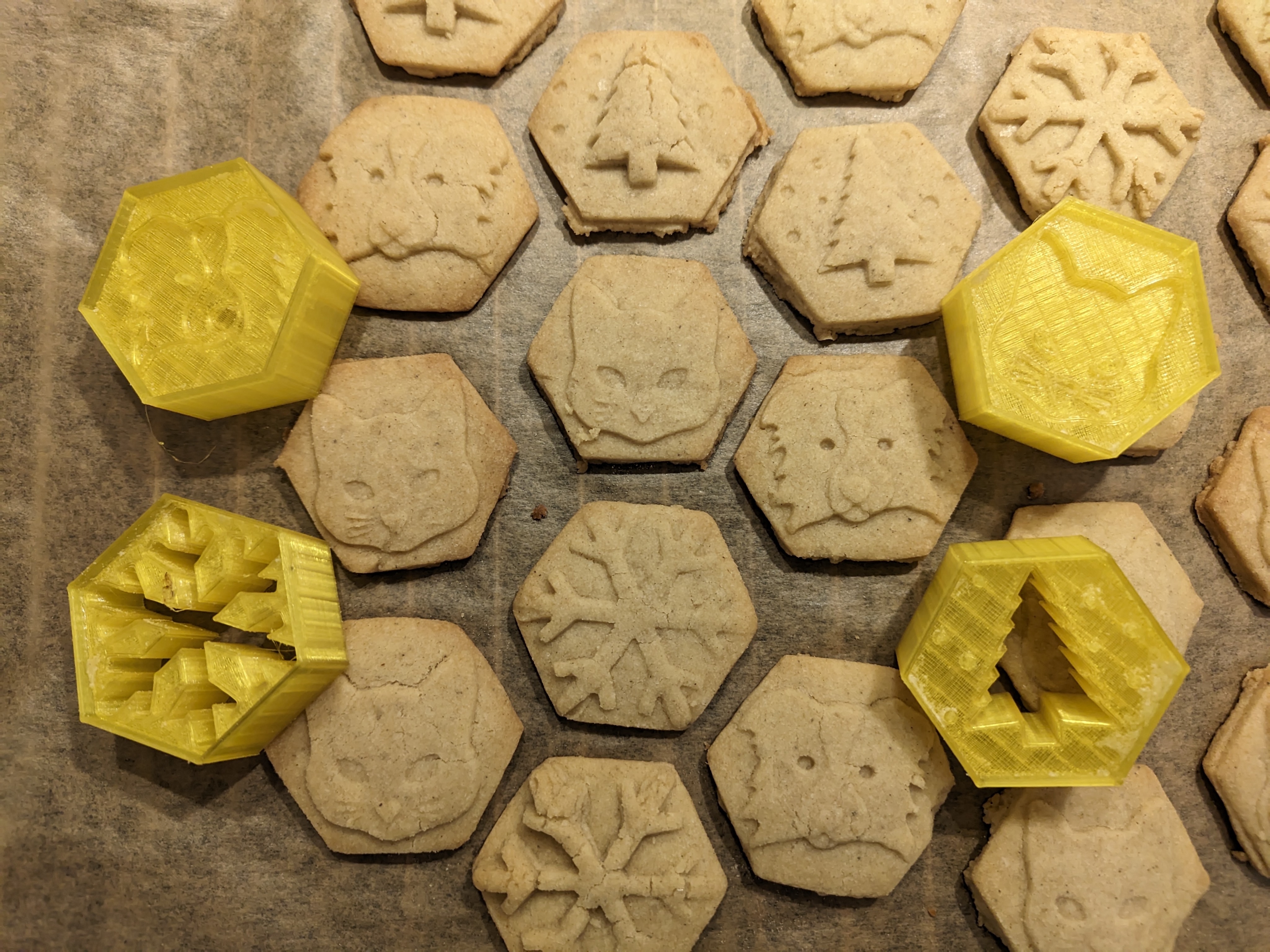 Khuôn đóng dấu bánh quy có hình lục giác vừa đẹp mắt vừa giúp sử dụng bột làm bánh hiệu quả. Tôi khuyên bạn nên in bằng PETG nếu có thể, vì nó cho phép làm sạch bằng máy rửa chén (tránh chế độ sấy do nhiệt độ cao). Dùng với PLA cũng được nhưng sẽ cần làm sạch bằng tay.