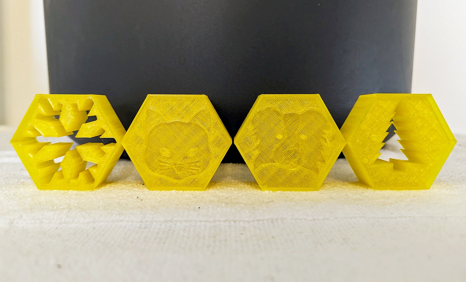 Bộ 4 khuôn cắt bánh quy kiêm đóng dấu ngược với họa tiết cây thông, bông tuyết, mèo, chó. Khuôn lục giác giúp thao tác dễ dàng, in bằng PETG để dễ vệ sinh. Phù hợp bột bánh dày 4-5mm. Có thể dùng để trang trí với đất nặn, đất sét. File STEP đi kèm để tùy chỉnh.