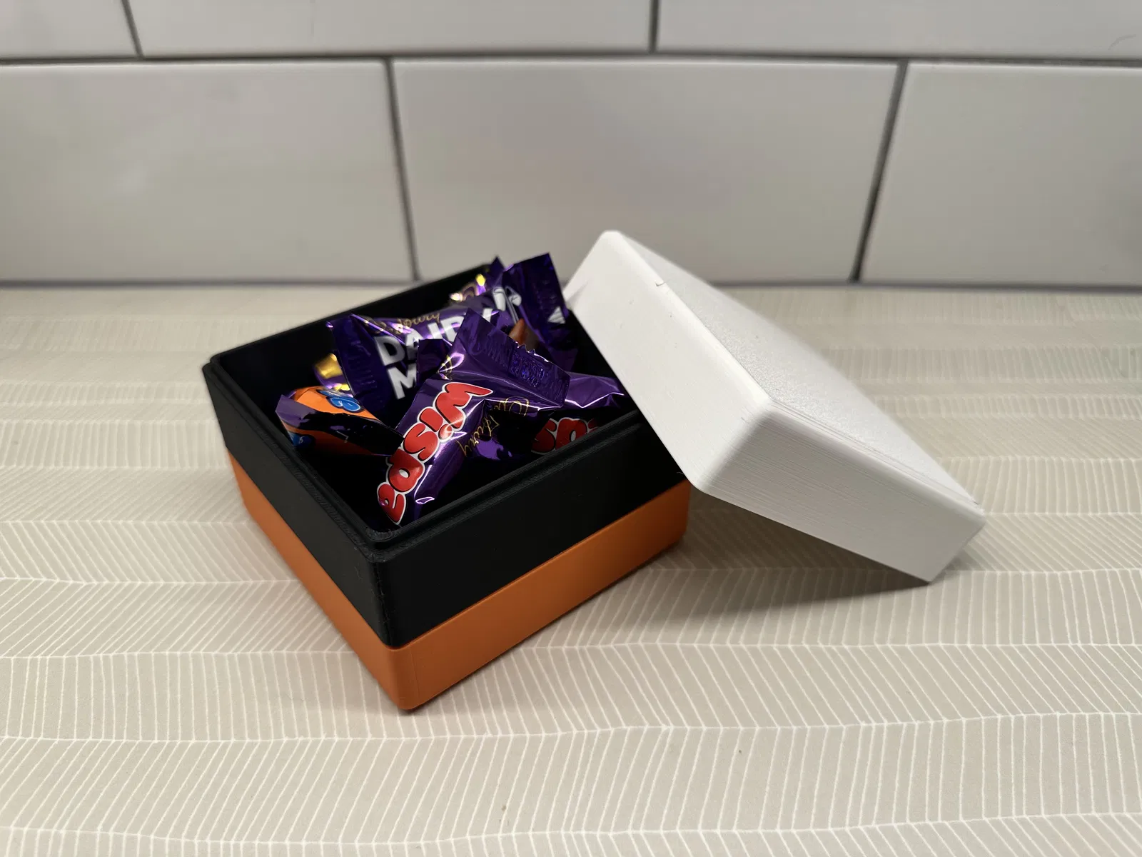 Hộp lưu trữ độc đáo, kích thước 10x10cm, hoàn hảo để đựng kẹo Liquorice Allsorts của bạn. Sản phẩm gồm 3 phần, dễ dàng lắp ghép bằng siêu keo. In bằng PLA mờ cho hiệu ứng đẹp mắt.