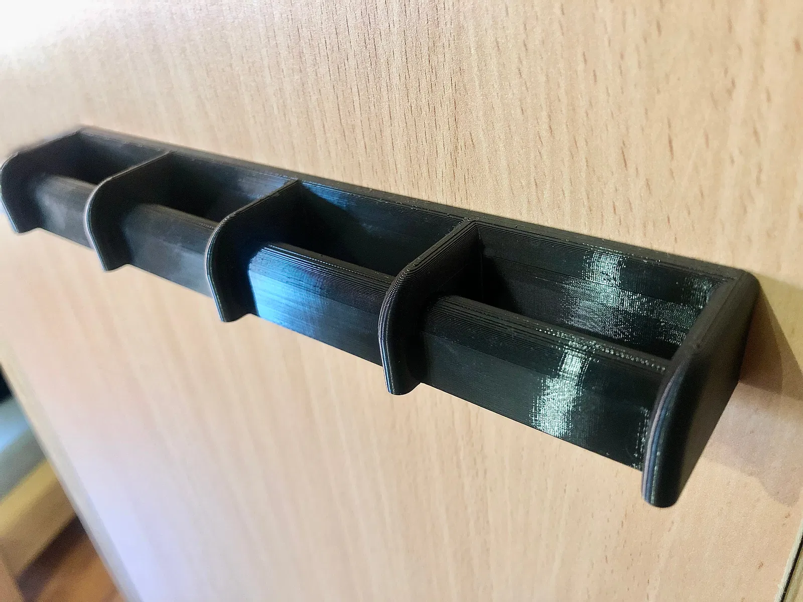 Giá treo cà vạt đơn giản, có thể gắn trên bề mặt phẳng, đựng vừa 4 chiếc cà vạt. Khe cà vạt rộng 46 mm. Có tùy chọn phiên bản cho 8 cà vạt. Dễ dàng tùy chỉnh kích thước và thêm lỗ gắn.