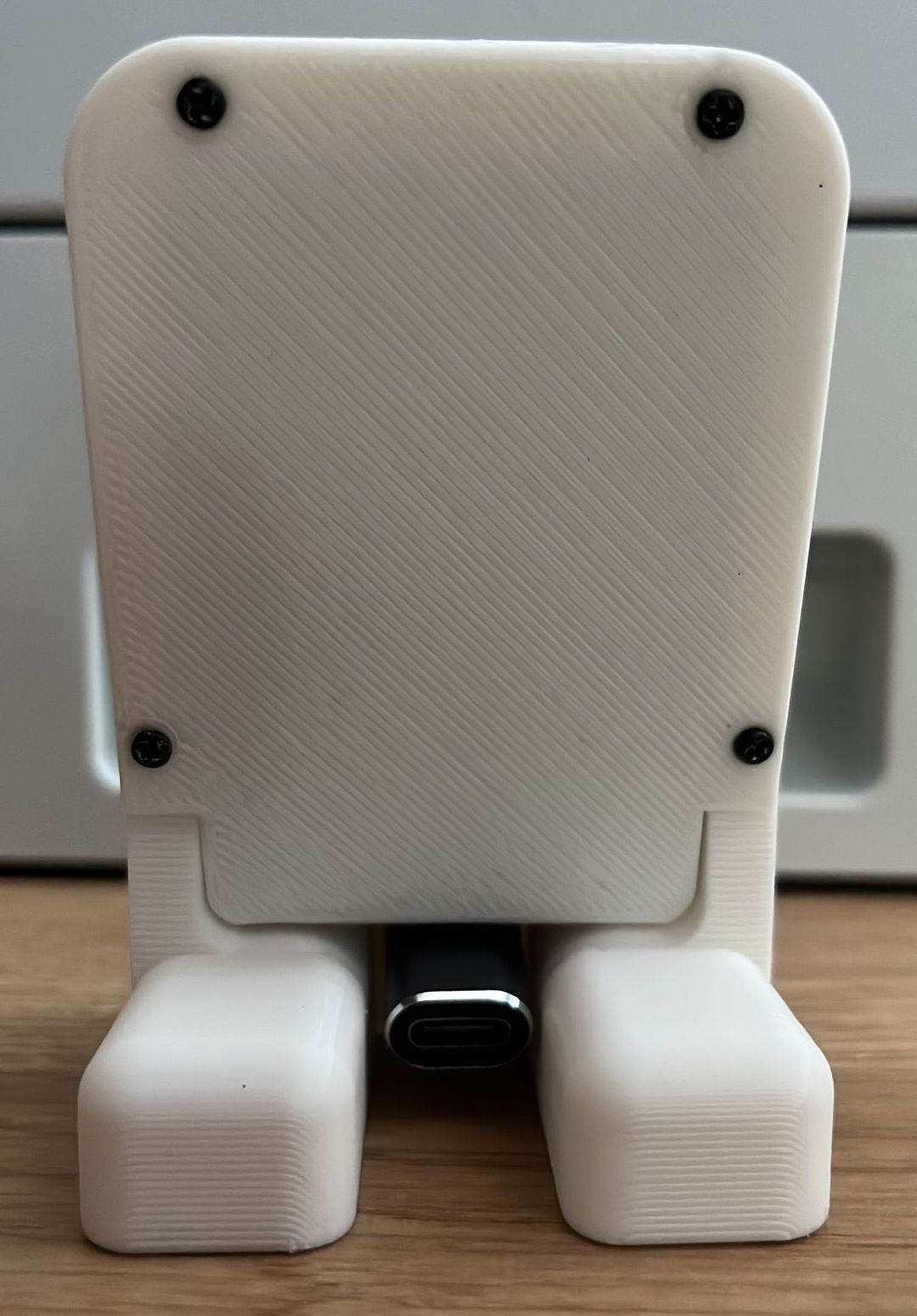 Nó được thiết kế để đặt trên bàn, mặt bàn, bàn cạnh giường, v.v., với bo mạch được nghiêng về phía sau khoảng 10 độ so với phương thẳng đứng. Nó sử dụng bộ chuyển đổi USB-C 90 độ để định tuyến cáp nguồn USB-C ra phía sau. Tôi đã dùng https://www.amazon.co.uk/dp/B0B8X6H96S nhưng các loại khác cũng ổn.