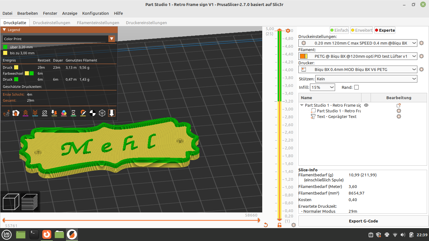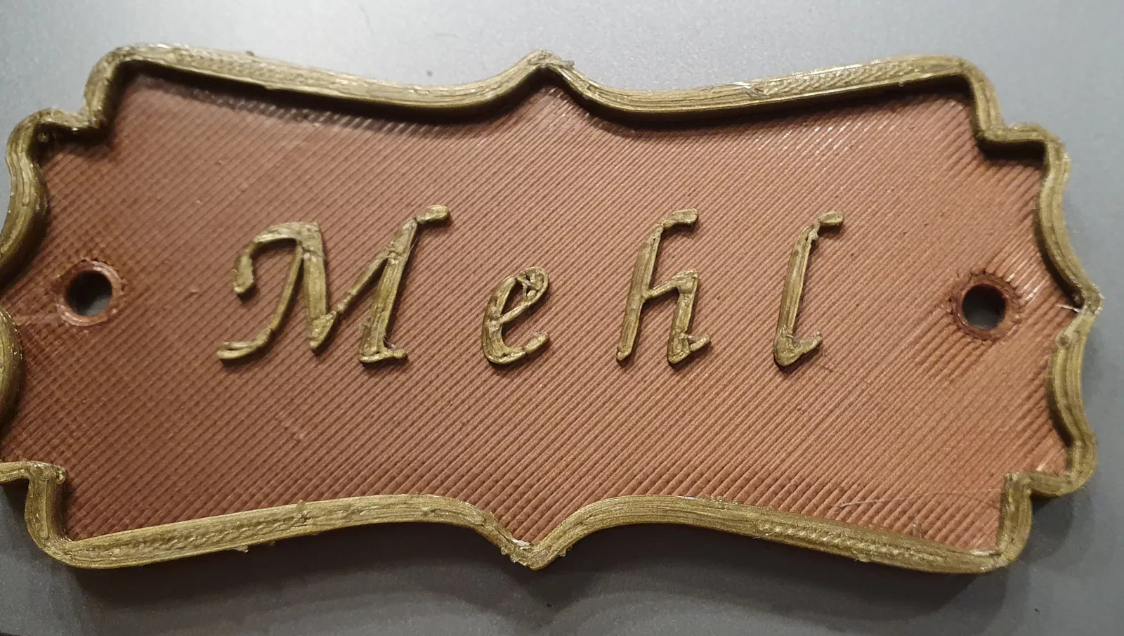 Chào mọi người, do mình không tìm được cái bảng hiệu nào ưng ý theo phong cách Baroque hết, nên mình tự làm một cái trên OnShape. Tiếc là nó bị ngược, nên mọi người nhớ xoay lại nha, còn vụ thêm chữ thì dễ nhất là làm trên Prusaslicer 2.7.0 mình đang xài trên Linux Mint.