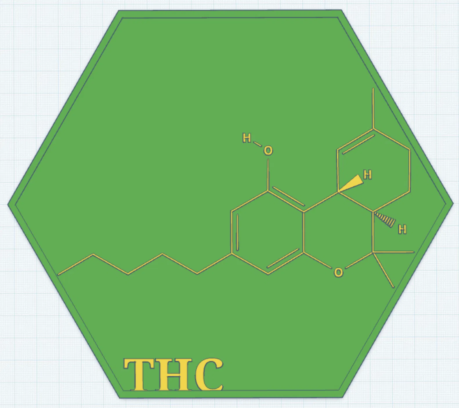 Đây là mô hình 3D của phân tử THC (Δ9-Tetrahydrocannabinol) được cách điệu hóa và có thể in 3D, hoạt chất chính trong cây cần sa. Được thiết kế dưới dạng tranh treo tường có khung, bao gồm các nguyên tử được ghi nhãn và khung hình lục giác bao quanh. Rất phù hợp cho những người yêu khoa học, phòng học hoặc trang trí tường hiện đại mang phong cách "nerdy".