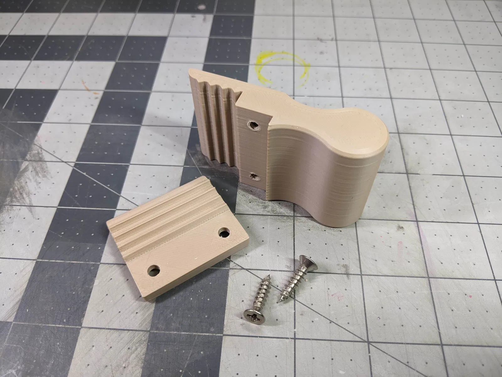 Dễ in và lắp ráp. Cần hai con vít kim loại đầu bằng #8 x ¾" (19mm) (mấy con vít trong hình cũng là loại tự khoan, nhưng không bắt buộc). Không chắc vít gỗ có xài được không vì nó có rãnh ren khác.