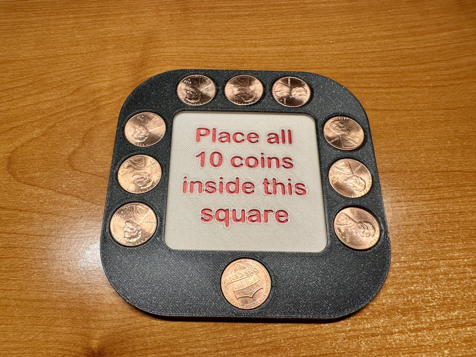 Mục tiêu của trò này là xếp sao cho 10 đồng xu vô cái ô vuông mà không có đồng xu nào bị chồng lên nhau, hay bị cong veo gì hết trơn á. Nó vừa khít luôn, chơi vui vẻ nha :)