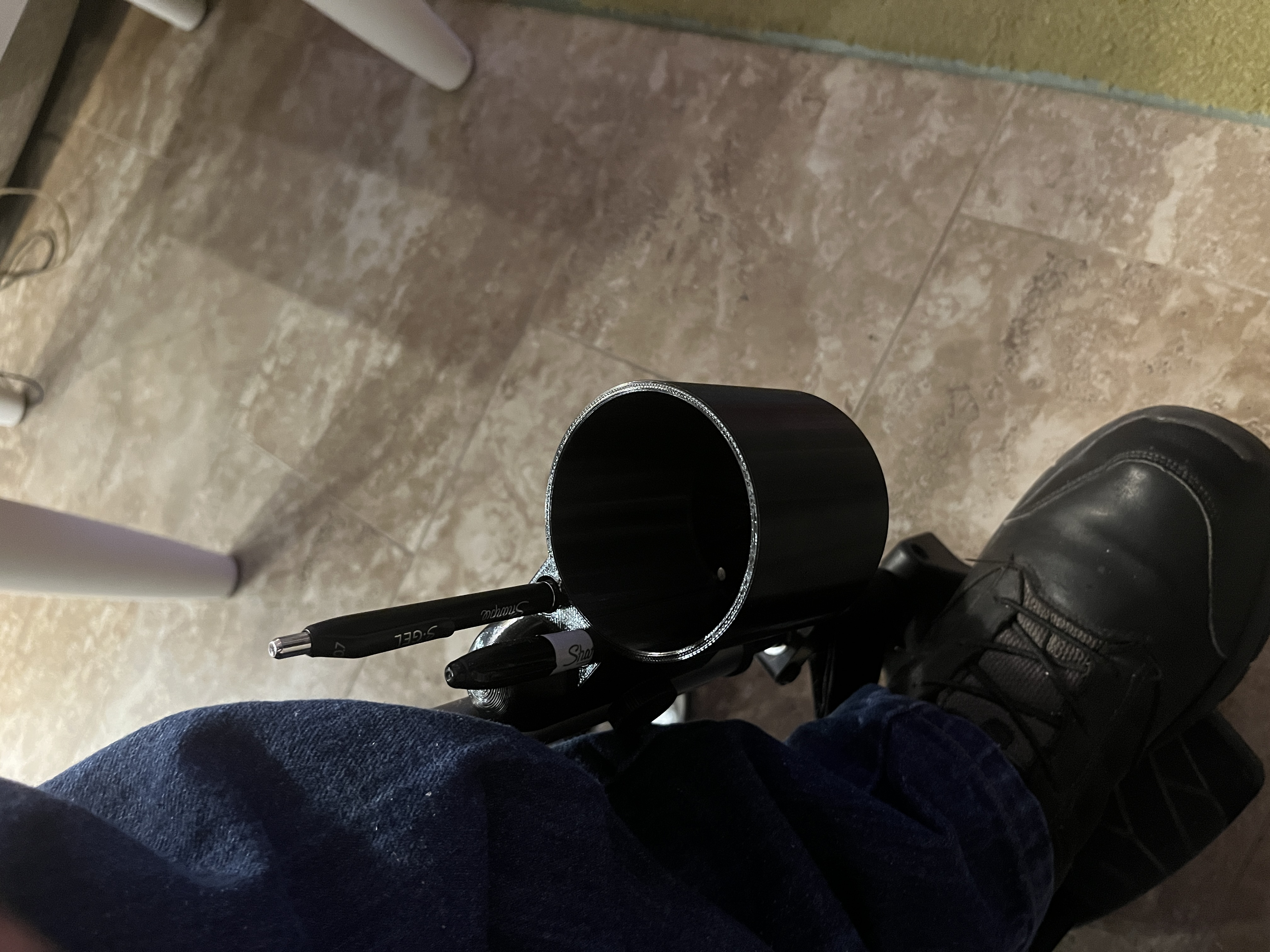Món đồ này có thể đựng ly lớn hoặc lon nước ngọt, bút Sharpie và bút bi. Nó gắn vừa vào chỗ để đồ gấp của xe lăn tiêu chuẩn. Tui dùng để đựng bình giữ nhiệt và hai cây bút trên xe lăn, rất tiện lợi cho việc di chuyển hoặc đi du lịch.