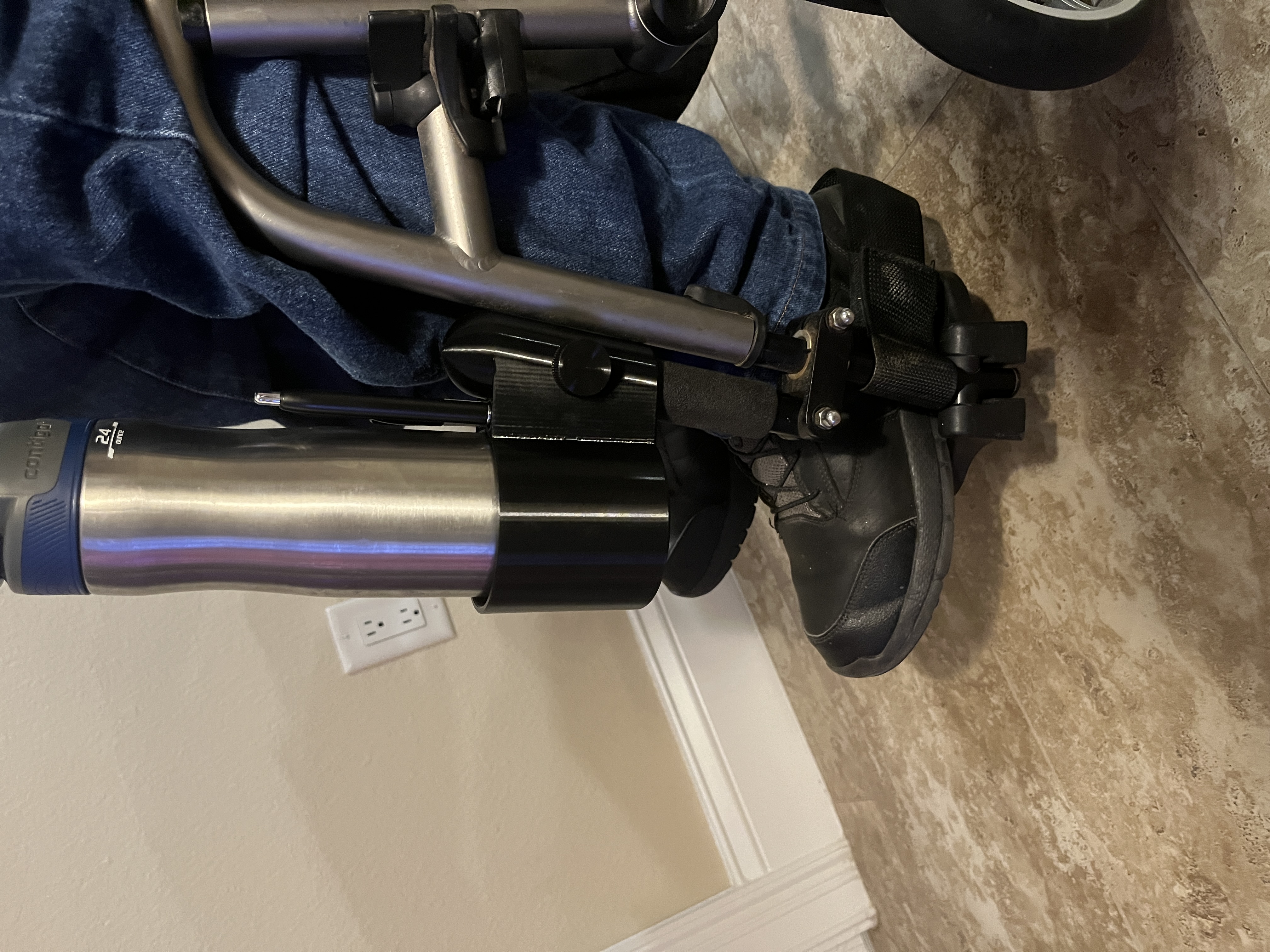 Tui dùng cái này để đựng bình giữ nhiệt với hai cây bút trên xe lăn nè. Nó có sẵn ren để gắn hai con ốc dẹp ¼-20 luôn nha. Tui thấy nó tiện ghê lắm. Lúc tui với bả đi dạo hay đi chơi á, tui xài hai cái luôn!