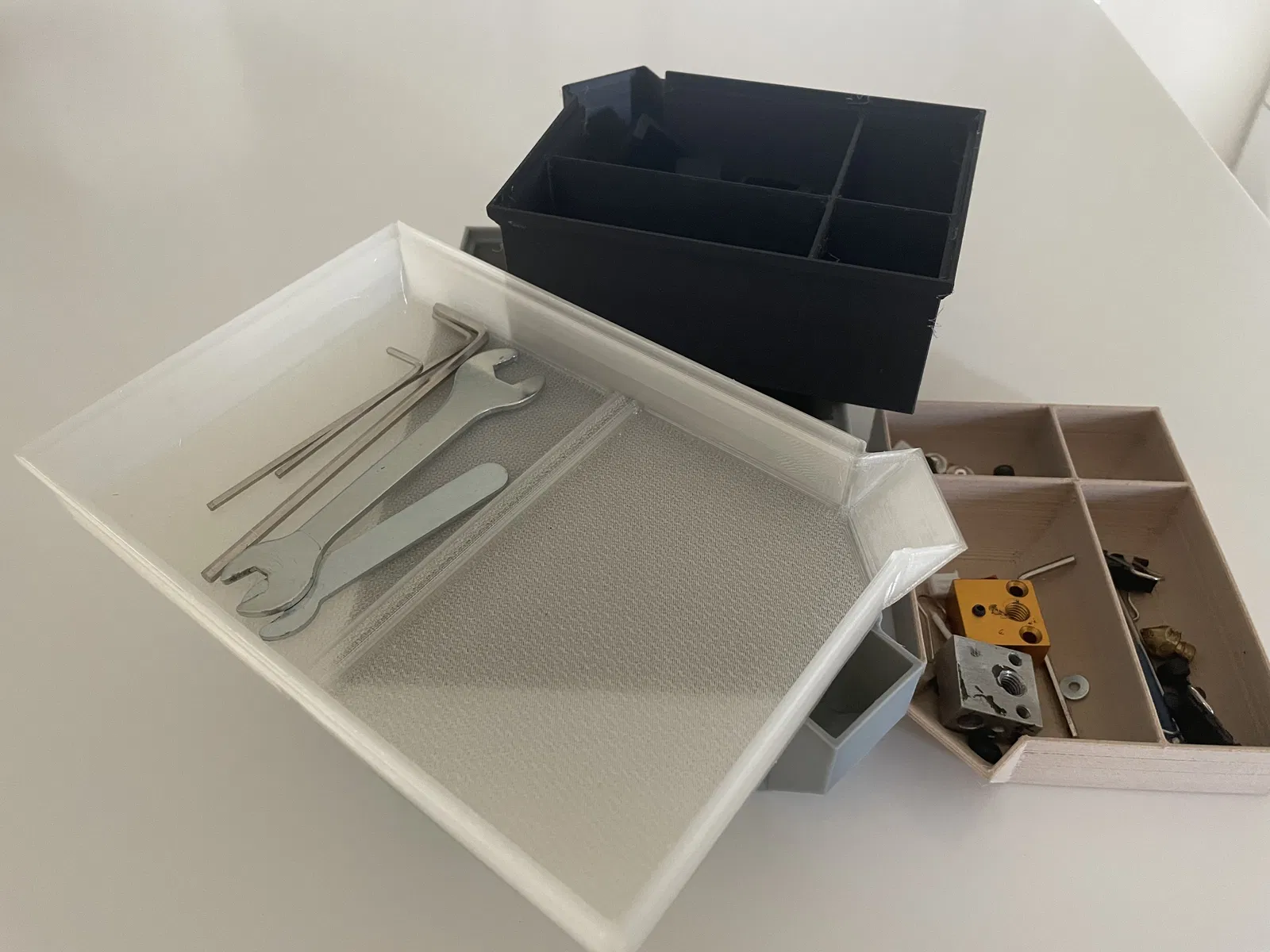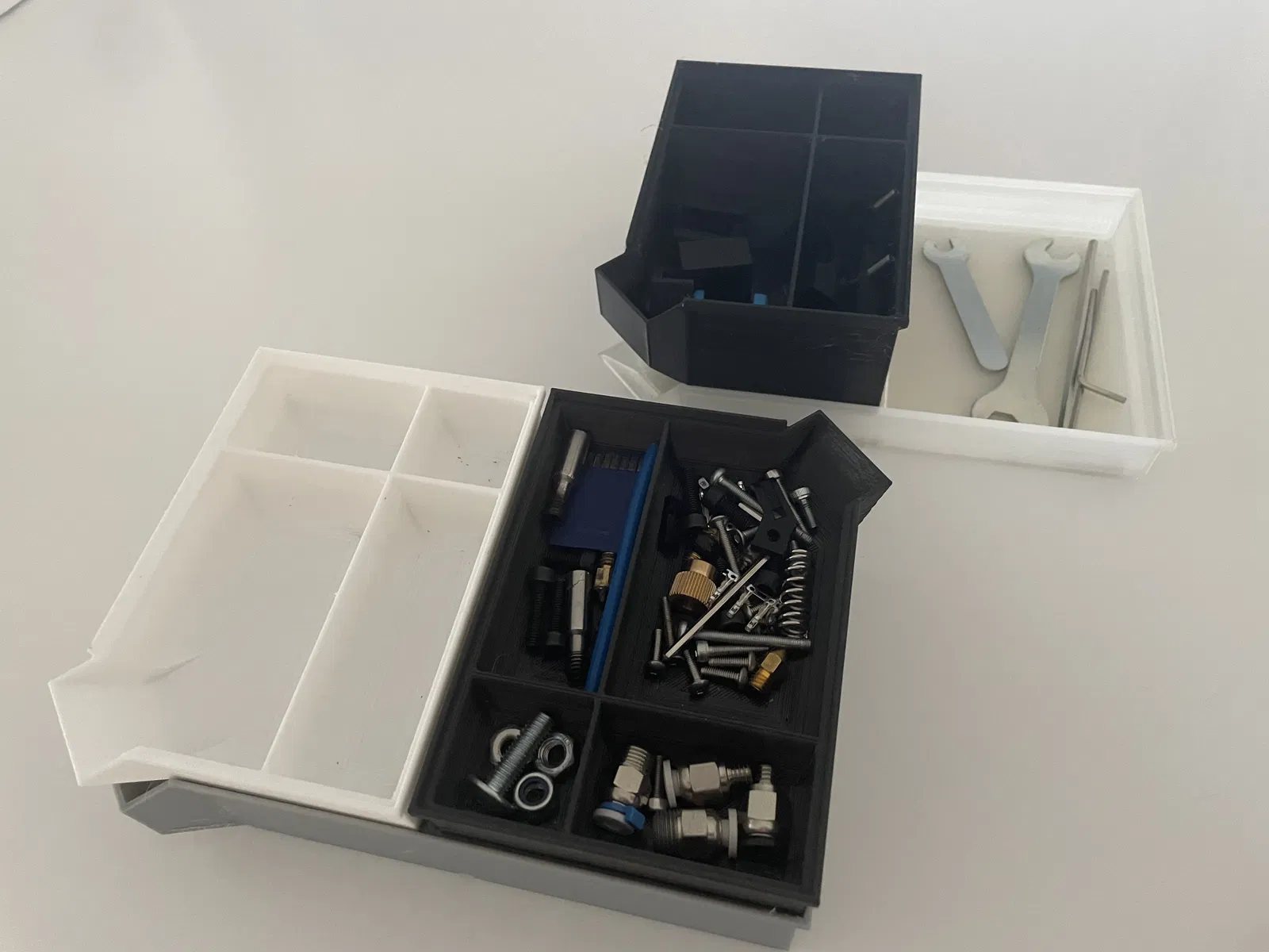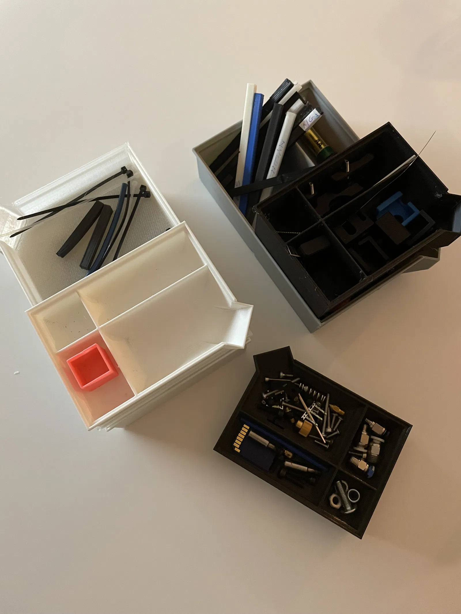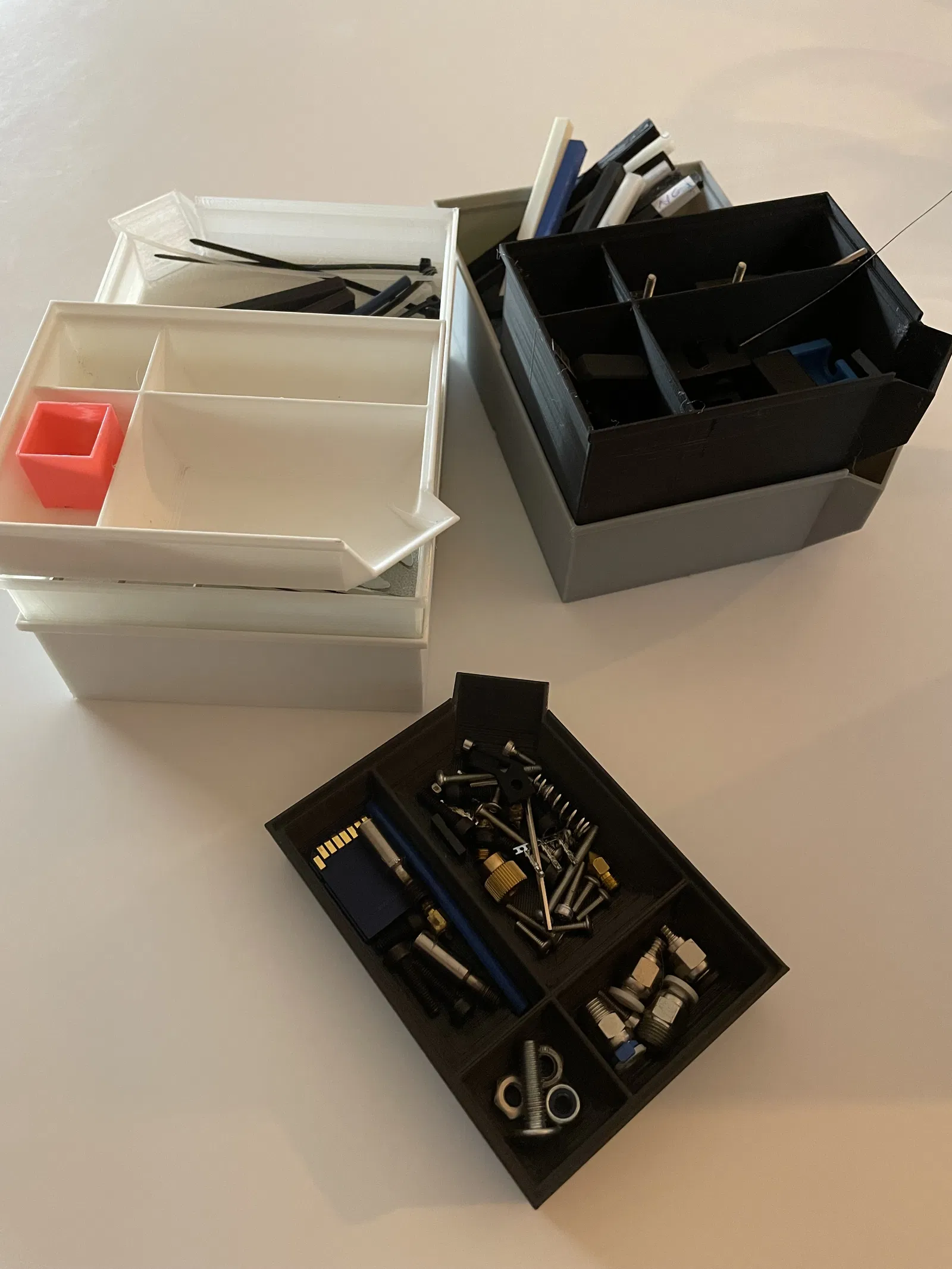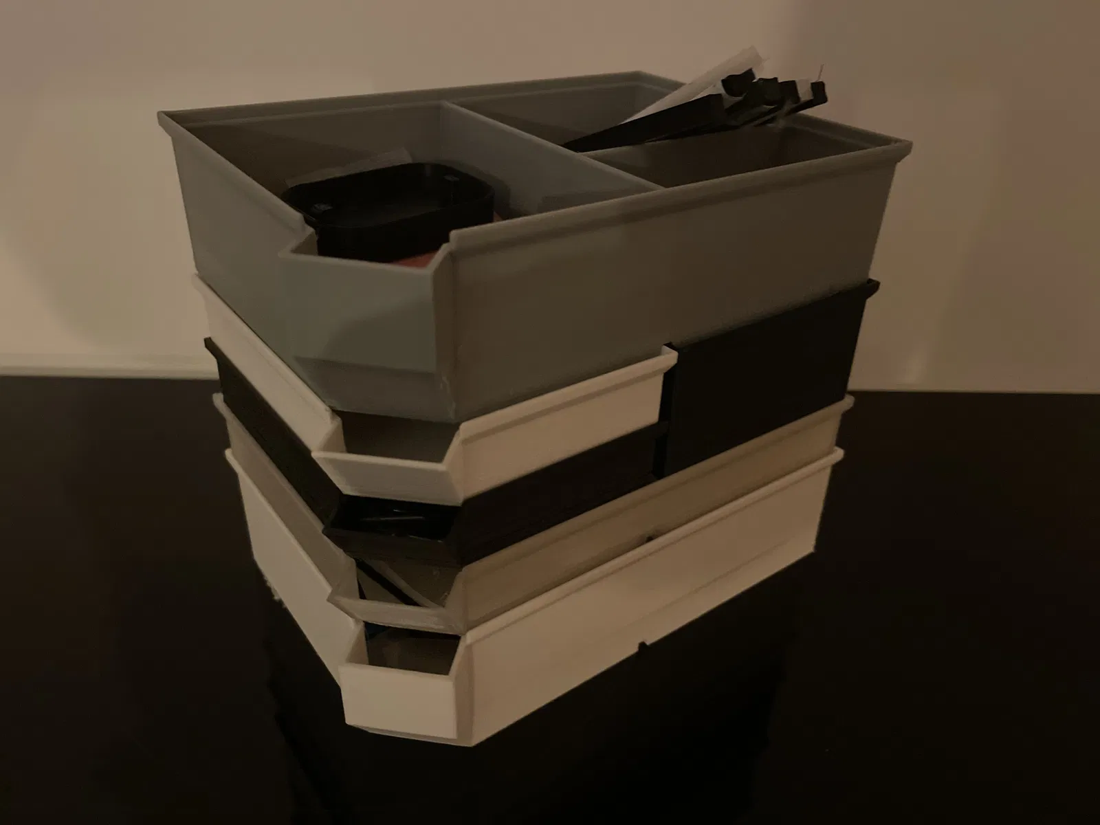 Hộp xếp chồng để đựng đồ vật nhỏ, có các ngăn và một khe thực tế để đổ đồ. Nếu bạn cần thêm ngăn, cứ nói cho tôi biết nha.