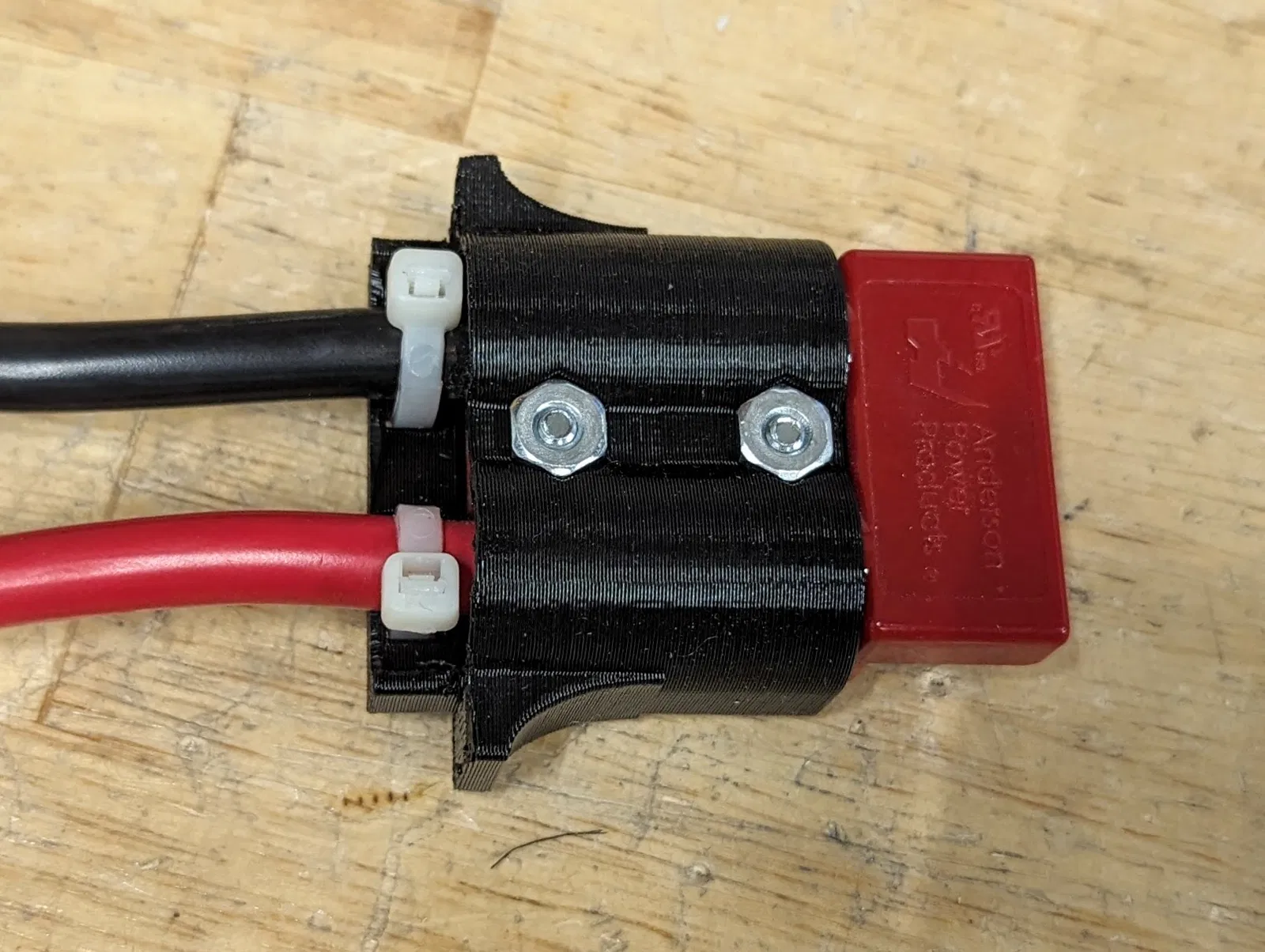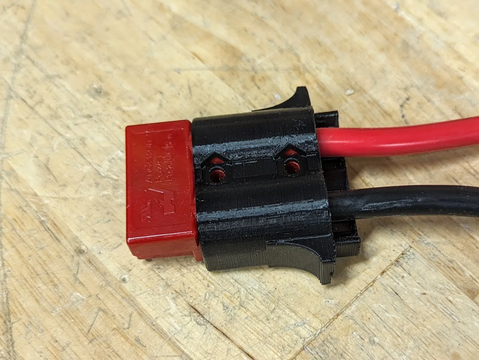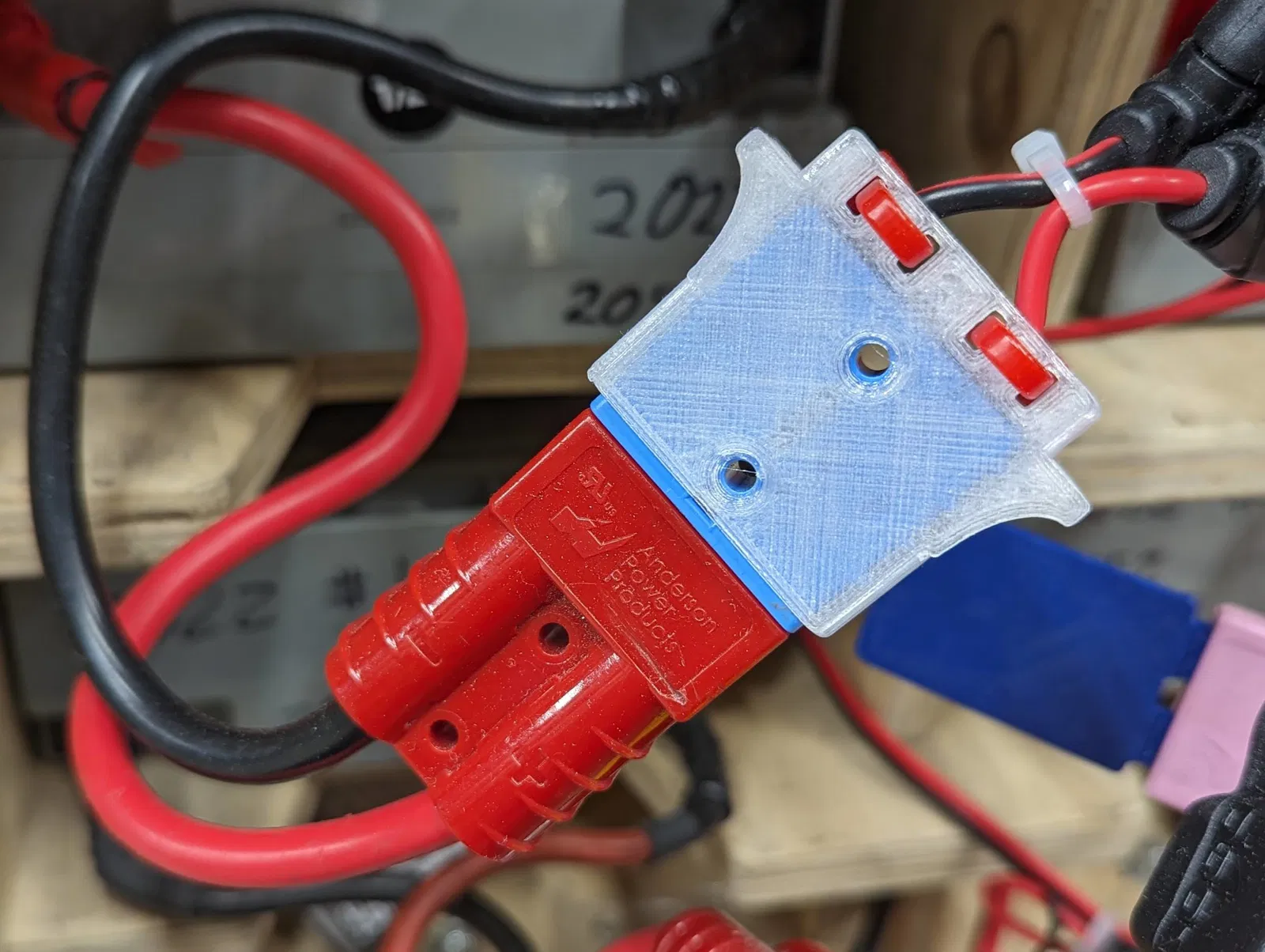 Đội FRC 2052 KnightKrawler dùng đầu nối Anderson SB50 cho pin và bộ sạc của họ. Mặc dù dây 6 gauge mà chúng tôi dùng cho pin khá chắc chắn mà không cần giảm sốc, nhưng dây có gauge cao hơn (nhỏ hơn) ở phía sạc dễ bị tổn thương hơn khi rút các đầu nối ra. Bộ giảm sốc gắn vừa với đầu nối SB50 và cung cấp chỗ để cố định dây bằng dây rút.