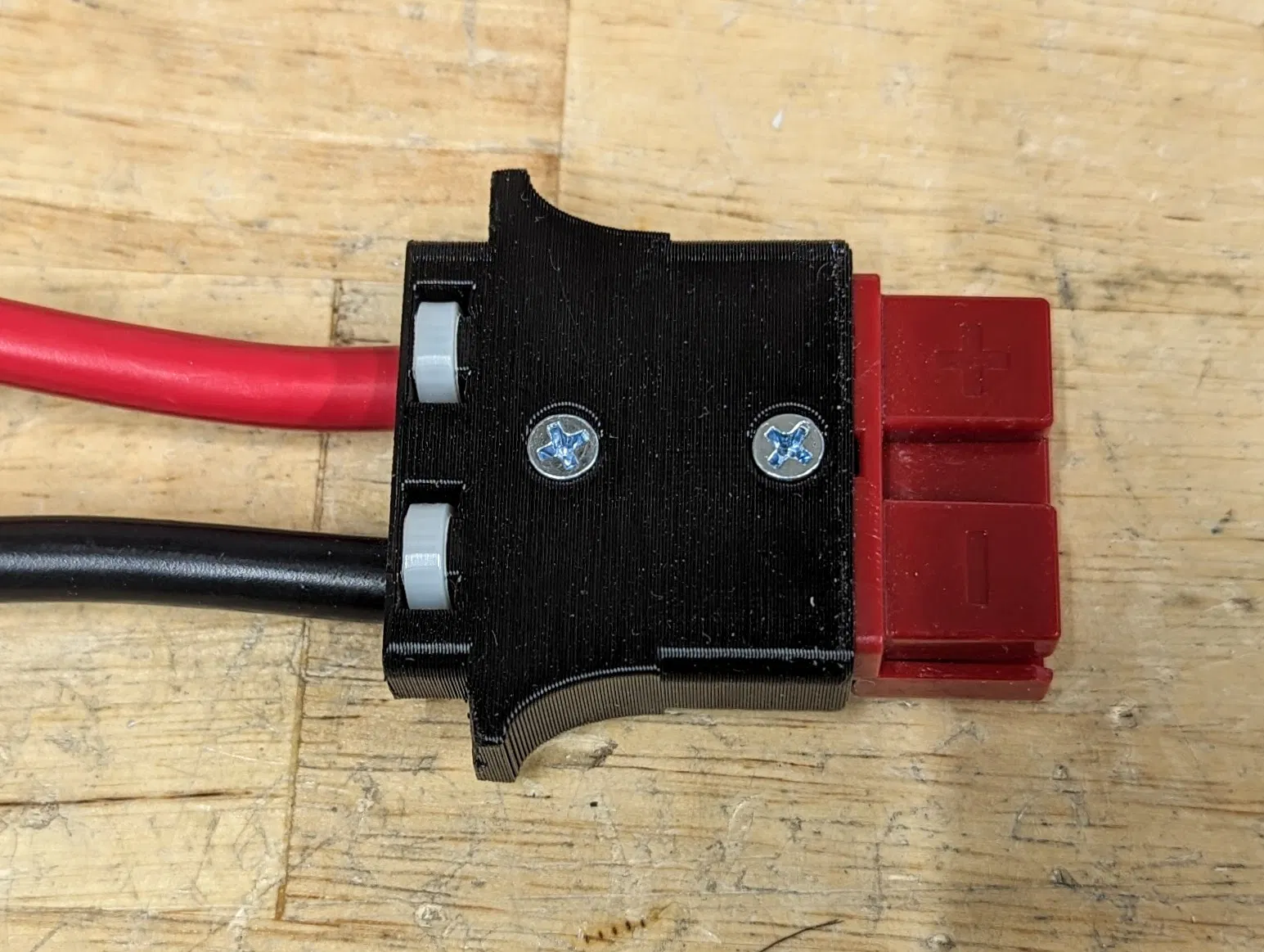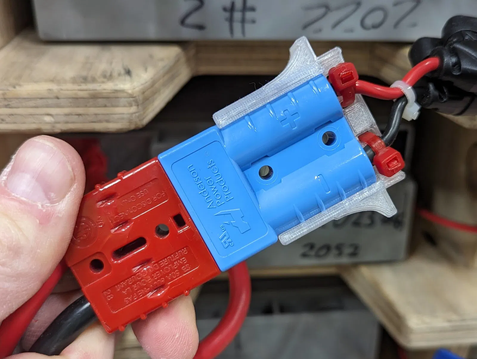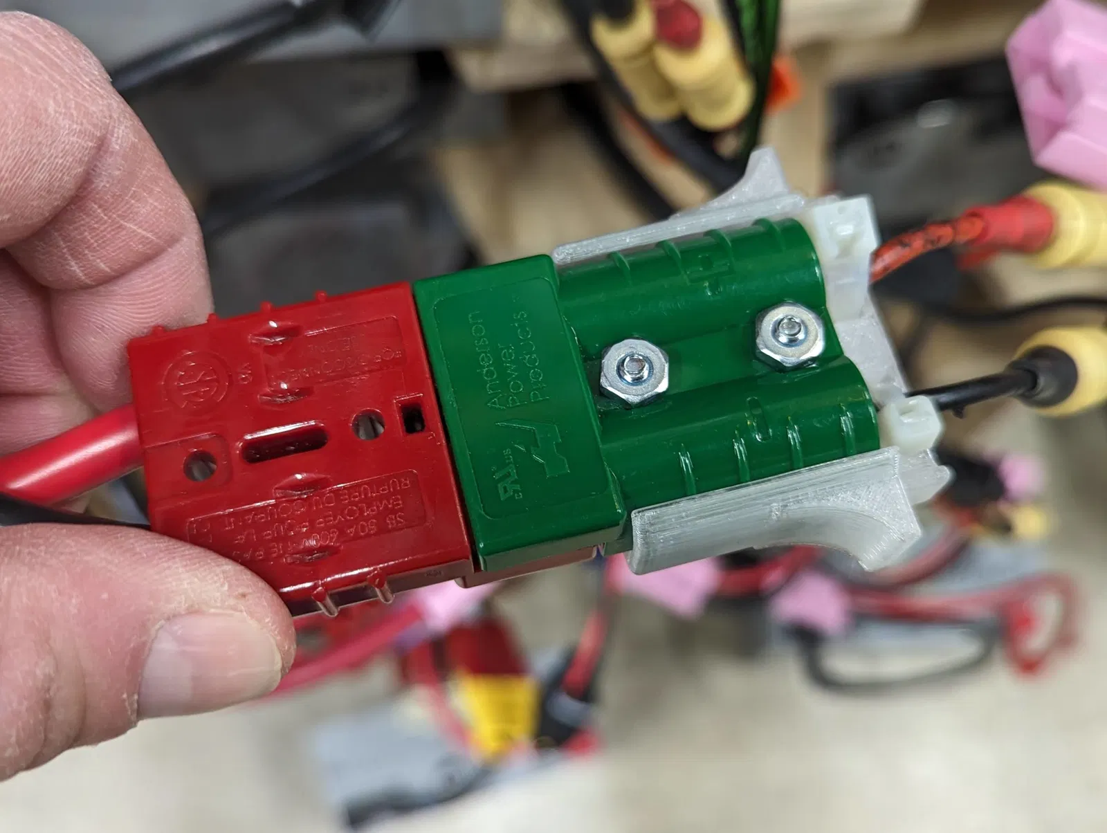 Đội FRC 2052 KnightKrawler dùng đầu nối Anderson SB50 cho pin và bộ sạc của họ. Mặc dù dây 6 gauge mà chúng tôi dùng cho pin khá chắc chắn mà không cần giảm sốc, nhưng dây có gauge cao hơn (nhỏ hơn) ở phía sạc dễ bị tổn thương hơn khi rút các đầu nối ra. Bộ giảm sốc gắn vừa với đầu nối SB50 và cung cấp chỗ để cố định dây bằng dây rút.