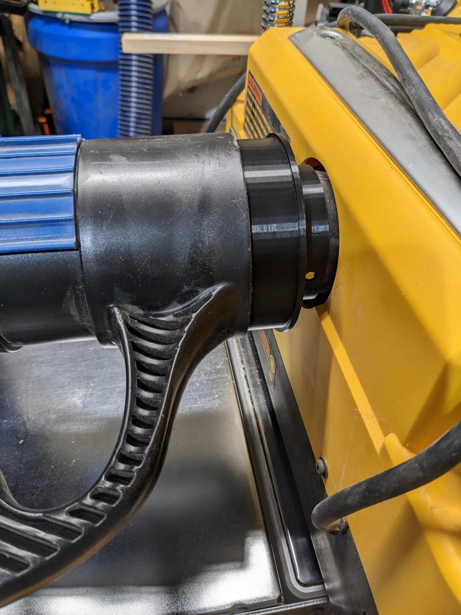 Hệ thống kết nối nhanh Dust Right Quick Connect của Rockler thì tuyệt vời, nhưng thật bực mình khi bạn mua một món đồ mà nó không theo kích thước tiêu chuẩn chỉ để phục vụ cho hệ sinh thái của họ. Trước cái bộ chuyển đổi này, bạn phải dùng bộ chuyển đổi kết nối nhanh từ 4" lên 4" (Nghiêm túc luôn Rockler, tại sao vậy?), nó làm tăng thêm điểm kết nối thêm 4" nữa. Với cái ống hút bụi nặng trịch, điều này tạo ra lực xoắn lớn hơn lên một bộ phận nhựa nhỏ trên một công cụ đắt tiền. Cái này trông có vẻ khắc phục được vấn đề bằng cách giảm đáng kể chiều dài.