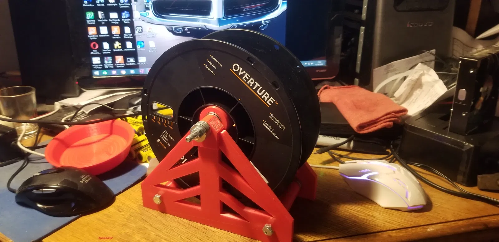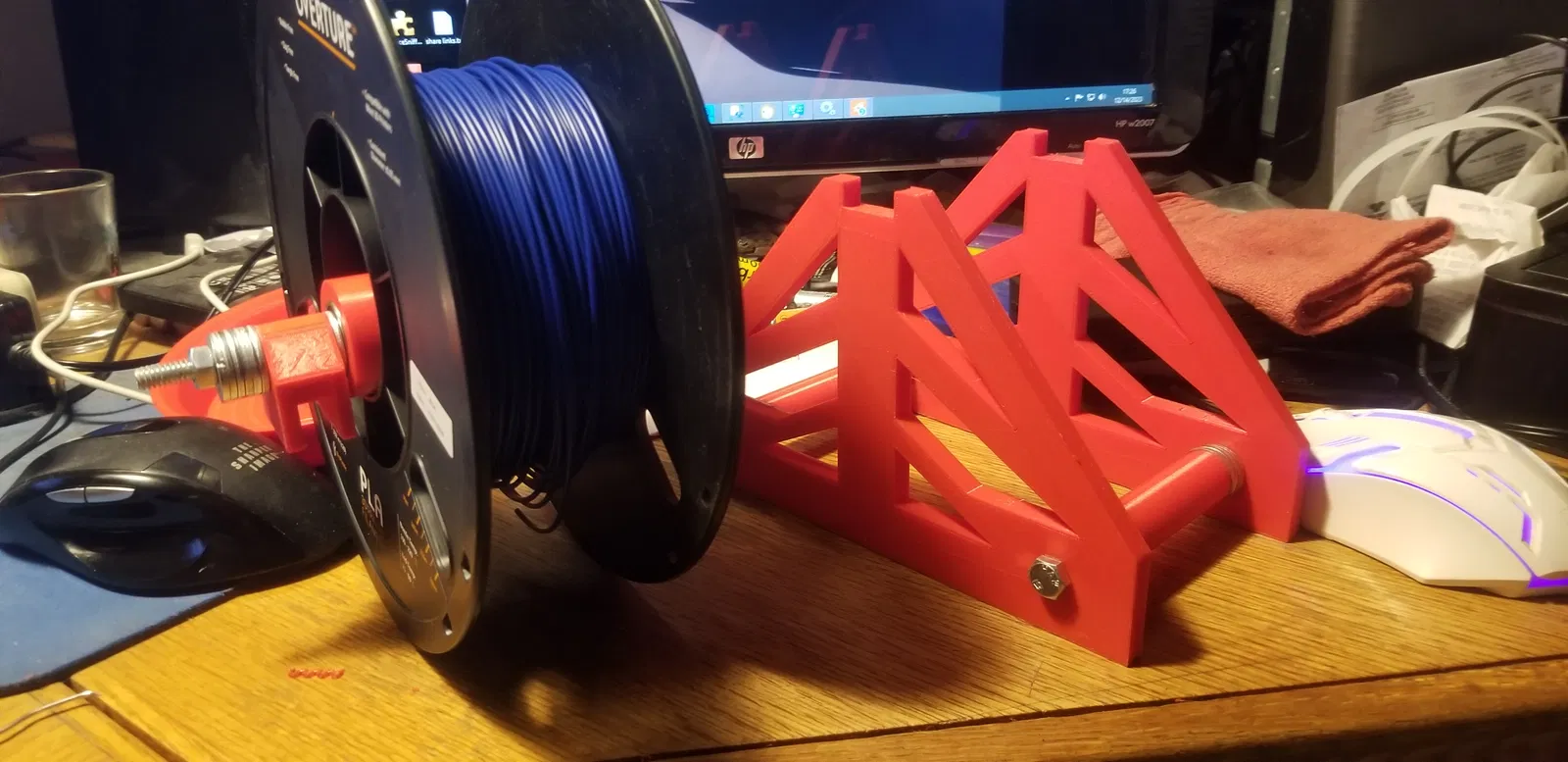 Phiên bản đầu tiên của đế giữ cuộn dây chắc chắn hơn. Tôi đã làm nó để ngăn cuộn dây gần hết bị văng ra khỏi các đế dạng con lăn. Tuy nhiên, tôi đã phải điều chỉnh lại kích thước các bộ phận để đạt được sự ổn định tối ưu.
