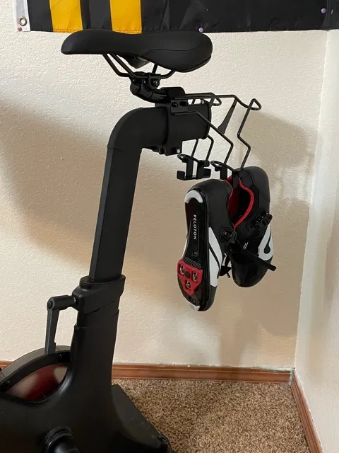 Móc treo giày Peloton gắn vào giá đỡ tạ của xe đạp. In hai cái để treo hai đôi giày.
