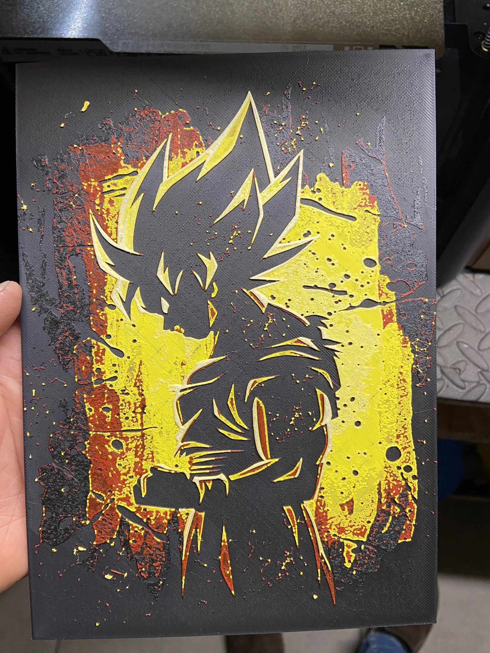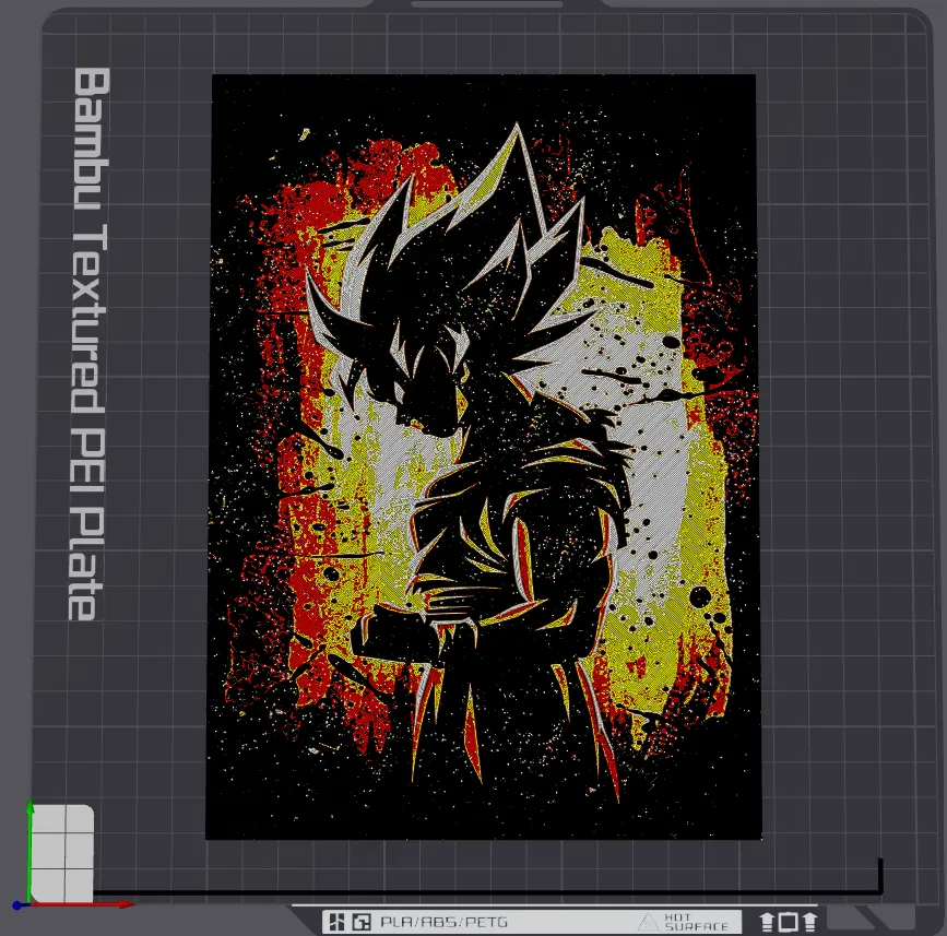 Mô hình tranh Sơn Goku 3D này được in bằng nhựa PLA với cài đặt lớp chi tiết. Hướng dẫn đổi màu bao gồm chuyển từ Đen sang Đỏ, Vàng, và cuối cùng là Trắng để tạo ra tác phẩm nghệ thuật rực rỡ.