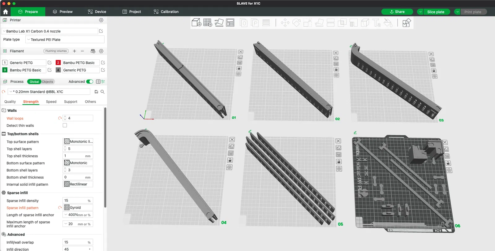 - Thông số in không chỉnh sửa ngoại trừ thêm một hoặc hai lớp tường: Filament thông thường (mình dùng Inland và BL PETG Basic – hết giữa lần in thứ hai này), 15% infill, lớp dày .2mm, giroid hoặc cubic adaptive. Brims tùy bạn và máy in của bạn. Mình dùng brims rất rộng để cẩn thận tránh cong vênh các bộ phận lớn (vâng, ngay cả PETG cũng có thể bị cong vênh trong X1C). Mình cũng dùng 4 lớp tường, phần lớn là do thói quen;