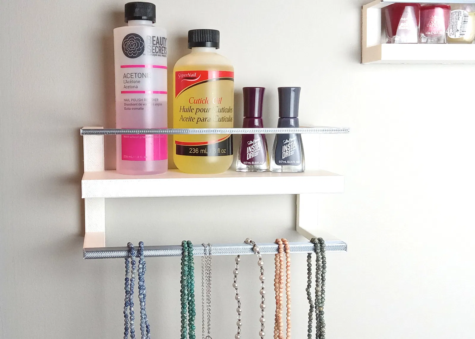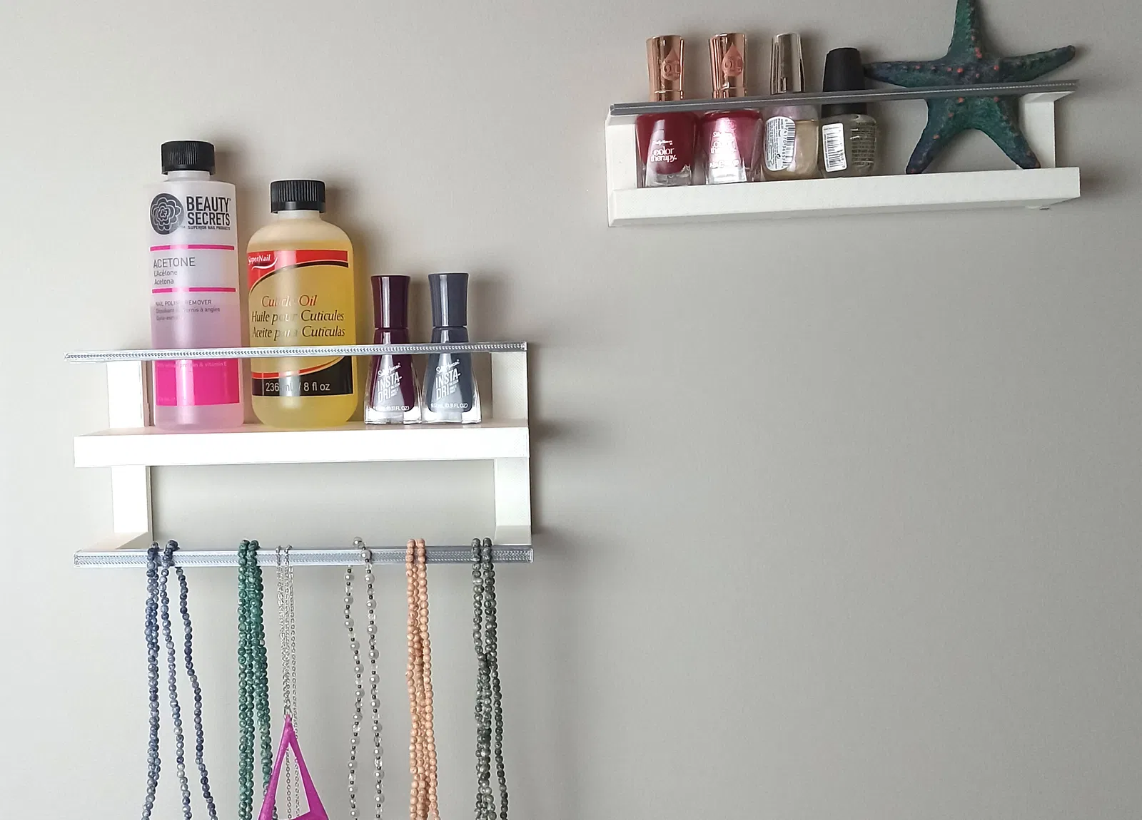 Có mấy cái kệ. Cả hai đều có thanh ngang riêng biệt. Một cái có thể gắn bằng Command Strips còn cái kia thì gắn bằng ốc vít tường.
