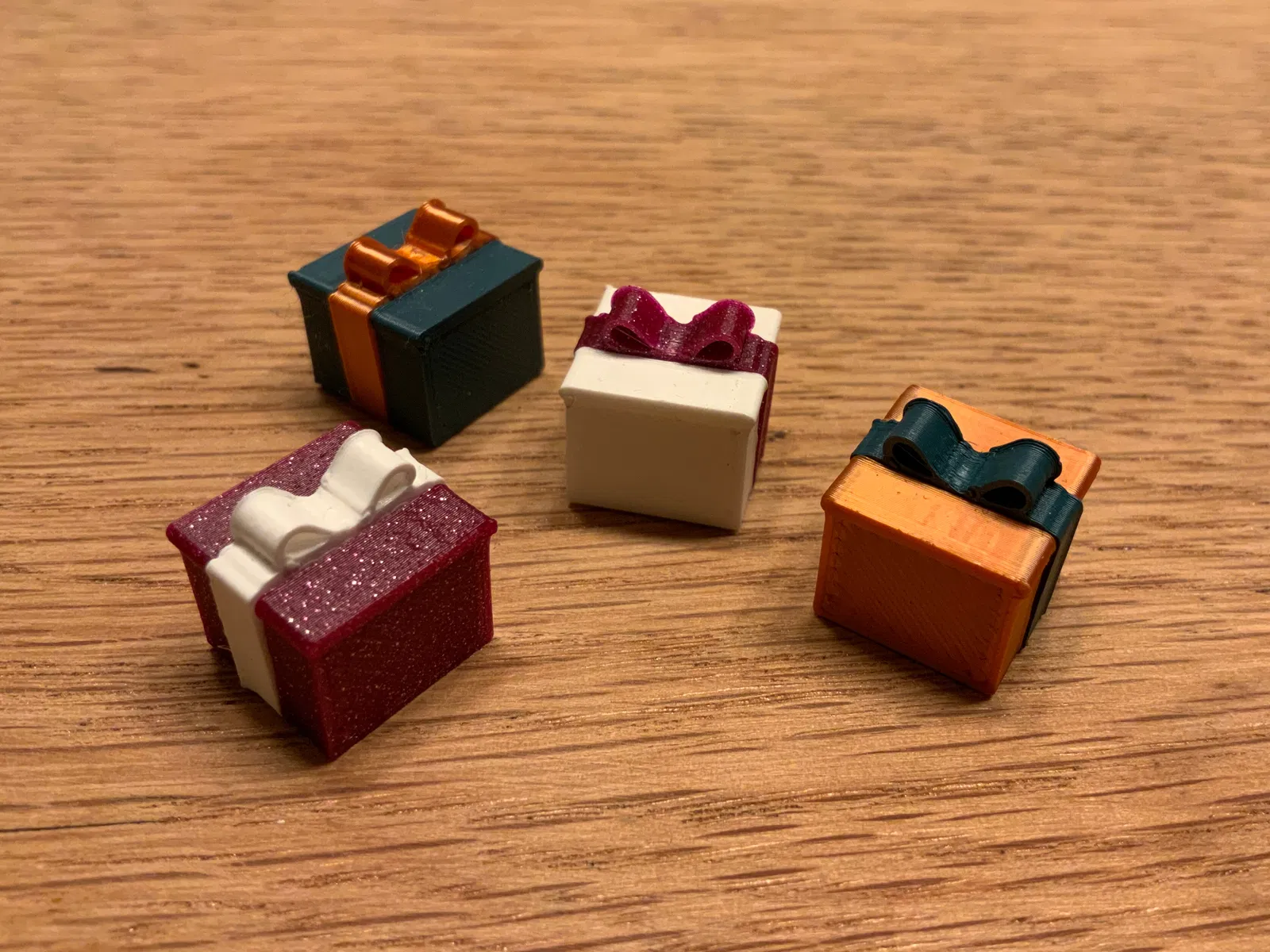 Mô hình hộp quà nhỏ xinh. In được đa sắc với máy in một đầu phun. Chỉ cần in bộ phận giữa với màu khác rồi lắp ráp. Dùng hai đoạn dây tóc filament (dài khoảng 9mm) làm chốt.