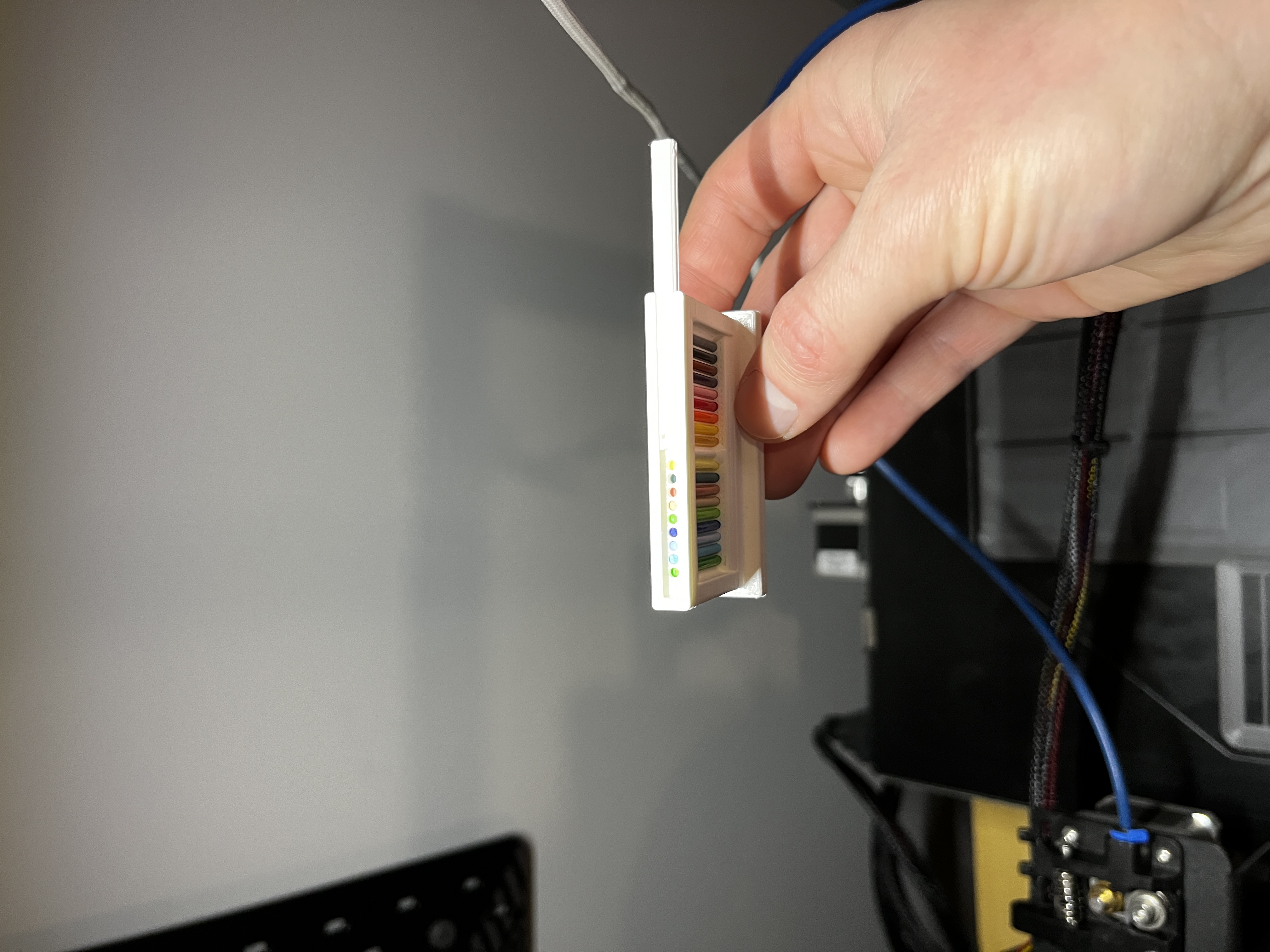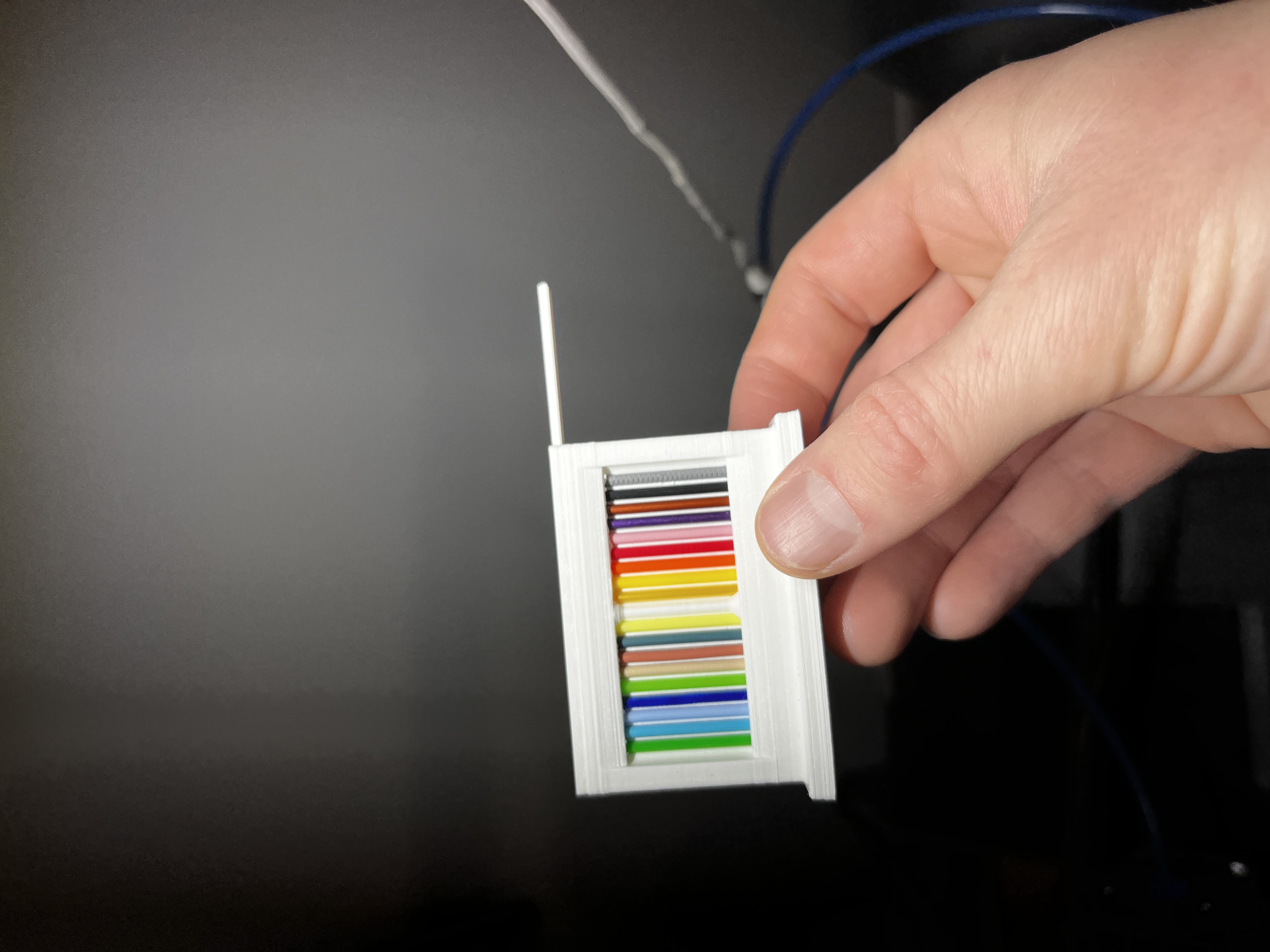 Đây là một bản in nhỏ để bạn có thể cắm thử từng sợi filament của mình, giúp thể hiện rõ các lựa chọn màu sắc mà bạn có. Chỉ cần cắt khoảng 32mm cho mỗi màu và đặt vào đế in sẵn.