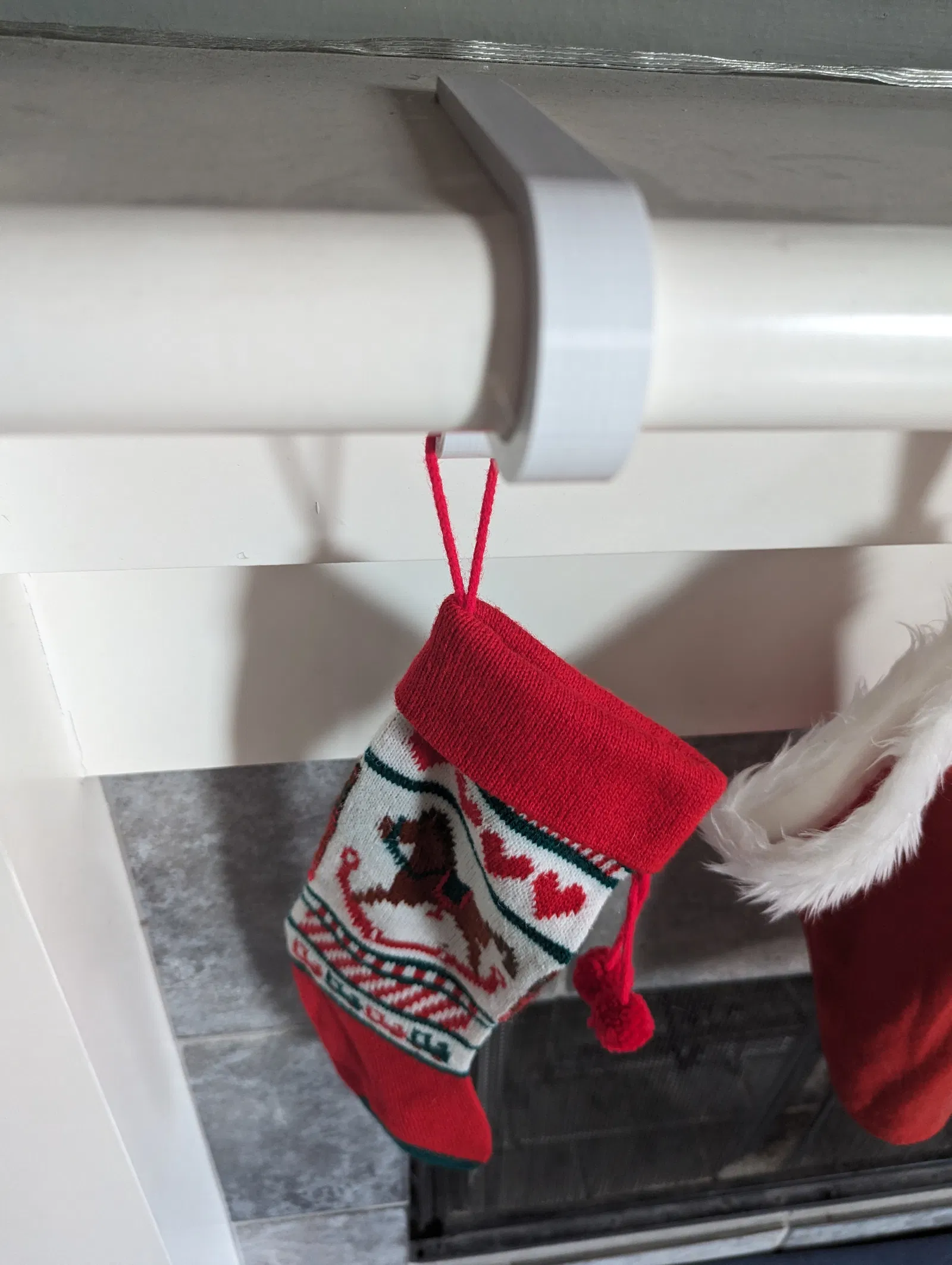 Mình muốn có một cách tạm thời để treo vớ Giáng sinh lên bệ lò sưởi và đã thiết kế ra cái này! Bệ lò sưởi nhà mình khá dài nên cái móc này quấn quanh và đảm bảo trọng lượng của vớ & đồ bên trong sẽ không làm nó bị nghiêng và rơi ra.