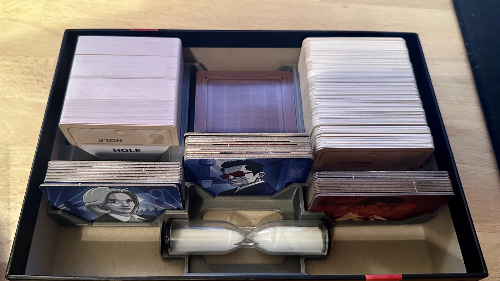 Tui muốn nhét được cả bản gốc lẫn bản mở rộng Deep Undercover vô chung một hộp luôn á. Tui thích cái thiết kế này lắm vì không cần in nắp riêng, thay vào đó, nó dùng nắp hộp giấy để giữ các lá bài. Các lá bài mở rộng được để riêng một ngăn với lá bài gốc. Bạn chỉ cần một bộ lá bài điệp viên, lá bài người qua đường và lá bài sát thủ thôi nha.
