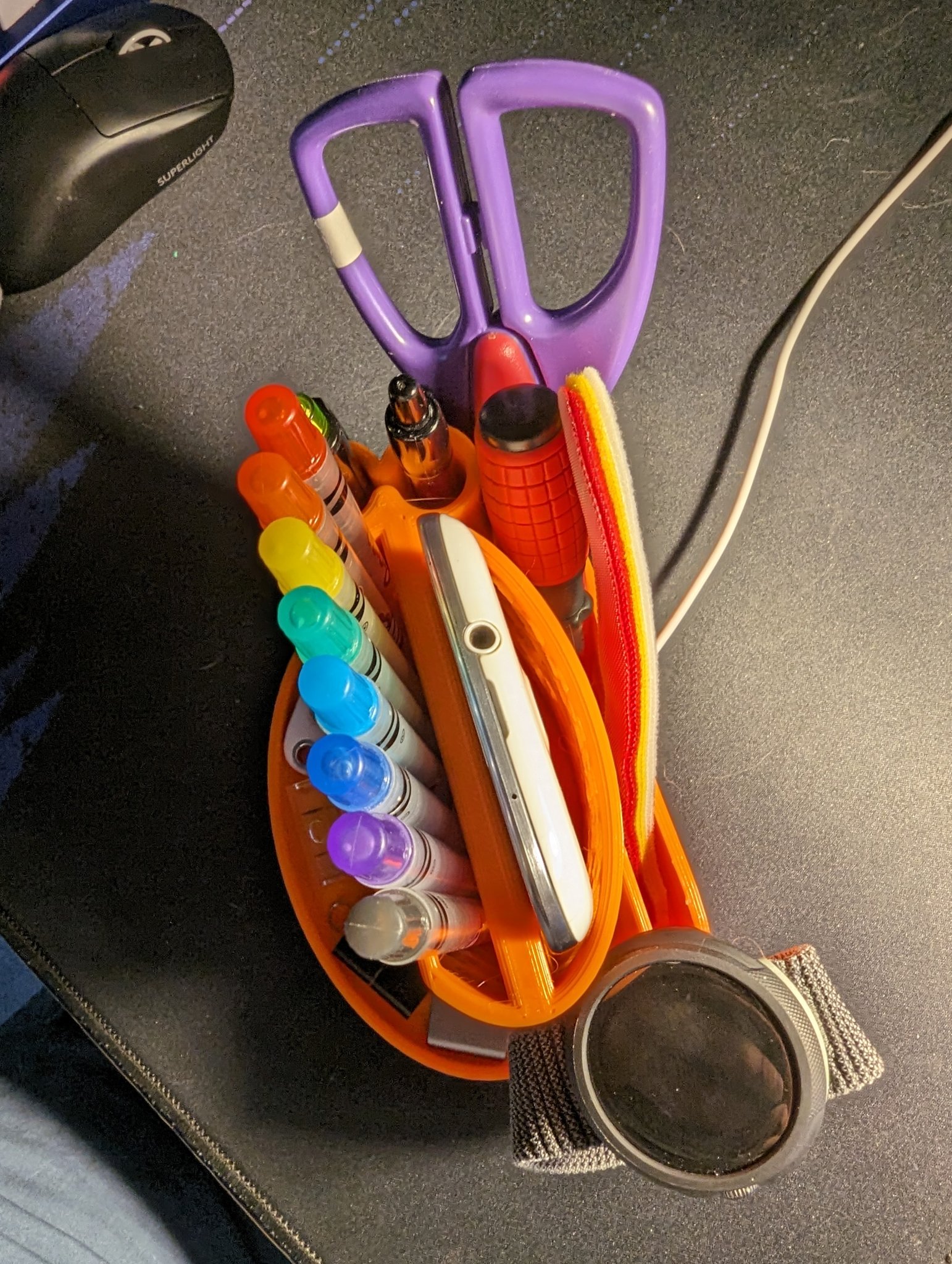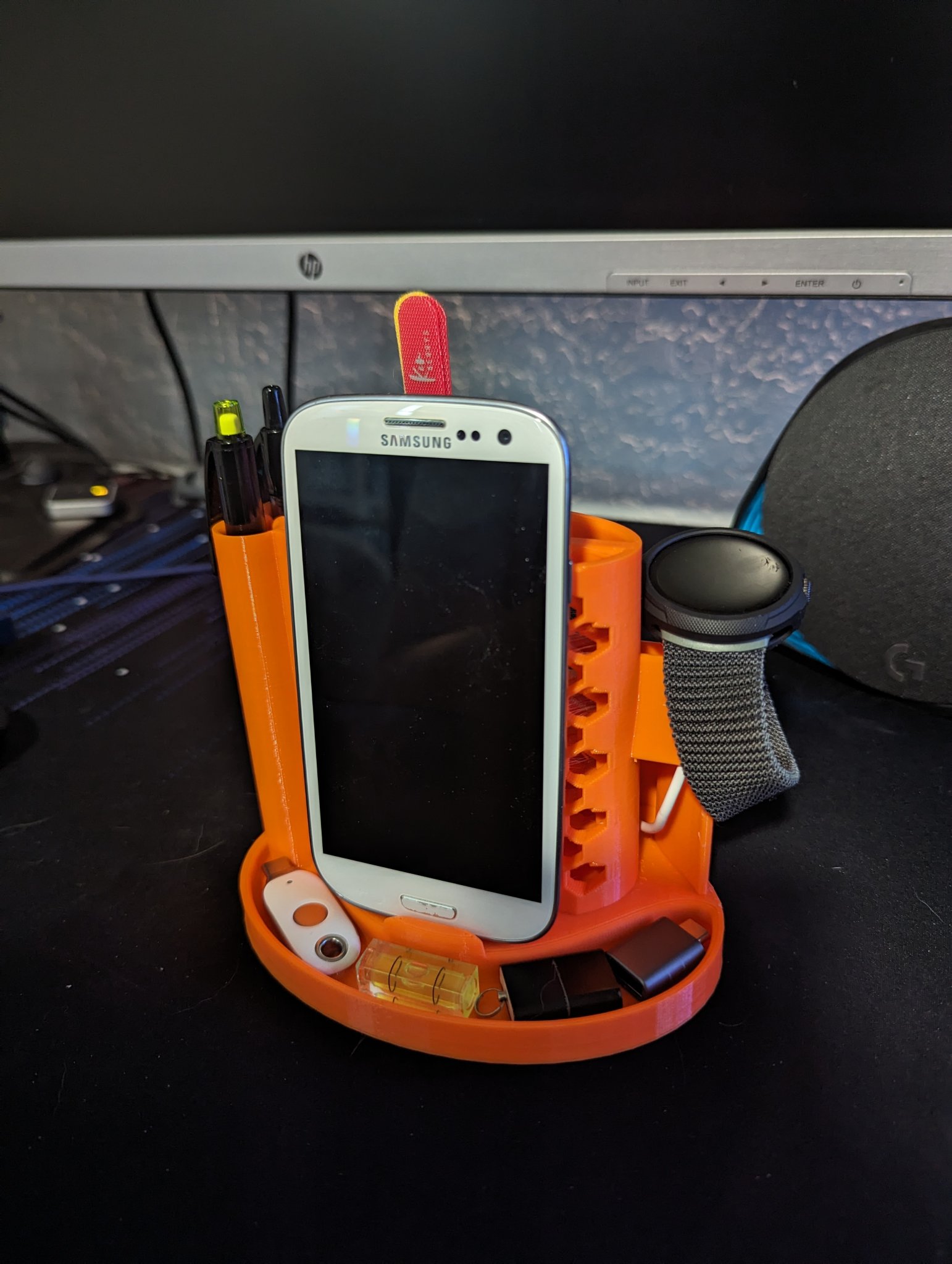 Tuyệt vời cho bất kỳ môi trường văn phòng nào, và cho bất kỳ ai thích giữ mọi thứ gọn gàng và ngăn nắp. Tôi thích rằng tôi có thể cất nó dưới màn hình máy tính của mình. Tôi đã thêm một khay ở phía trước giá đỡ vì tôi thường thấy mình có những đồ vật nhỏ lẻ tẻ nổi xung quanh bàn làm việc và cần một chỗ để đặt chúng. Điện thoại được chụp: iPhone 11 Plus và Samsung Galaxy S3, cũng hoạt động với Pixel 7 Pro. Mô hình này có thể mở rộng cho những người có điện thoại lớn hoặc chỉ cần một chút không gian hơn cho các vật dụng. Tôi đã chọn giữ mọi thứ càng gọn gàng càng tốt.