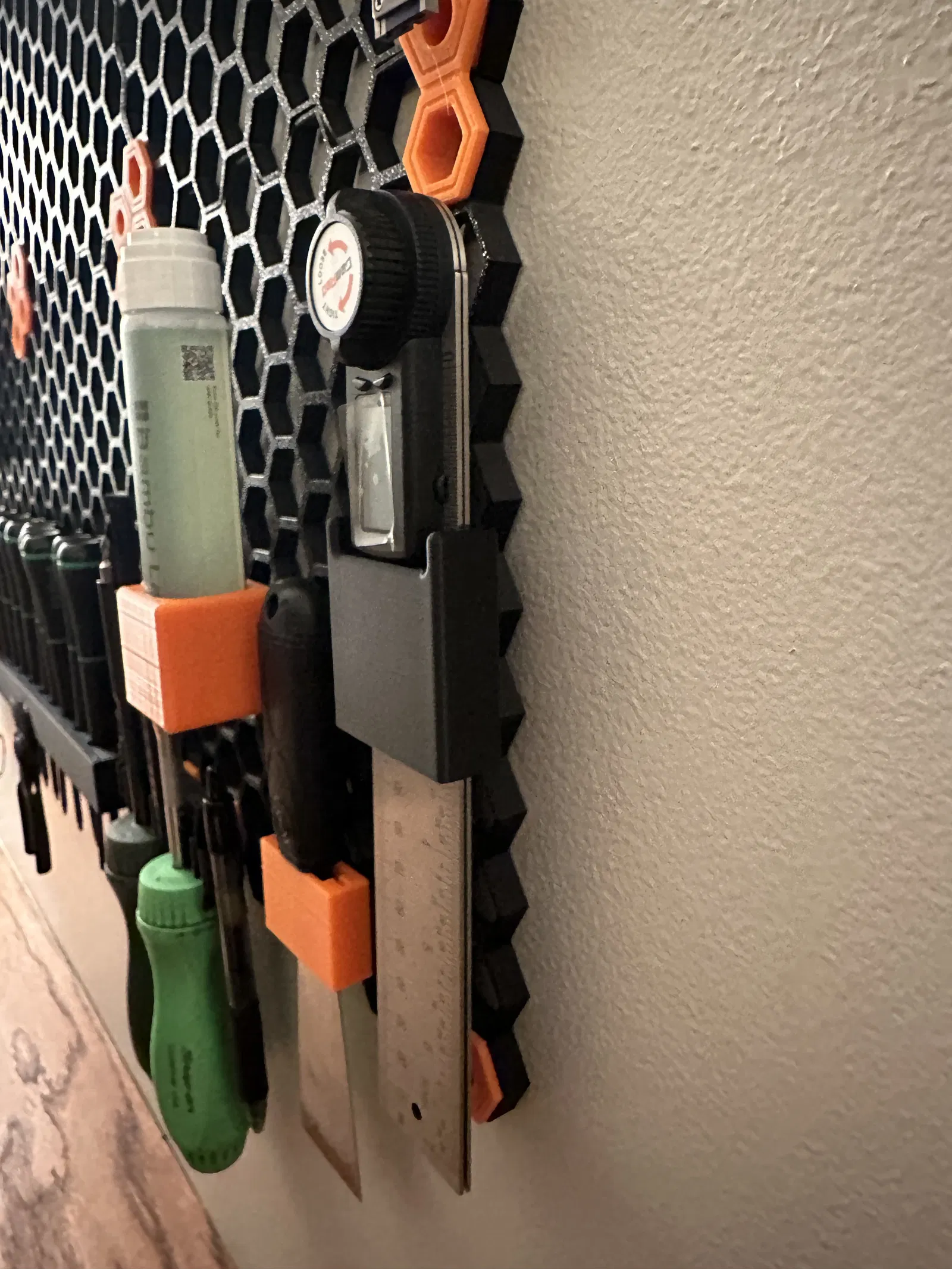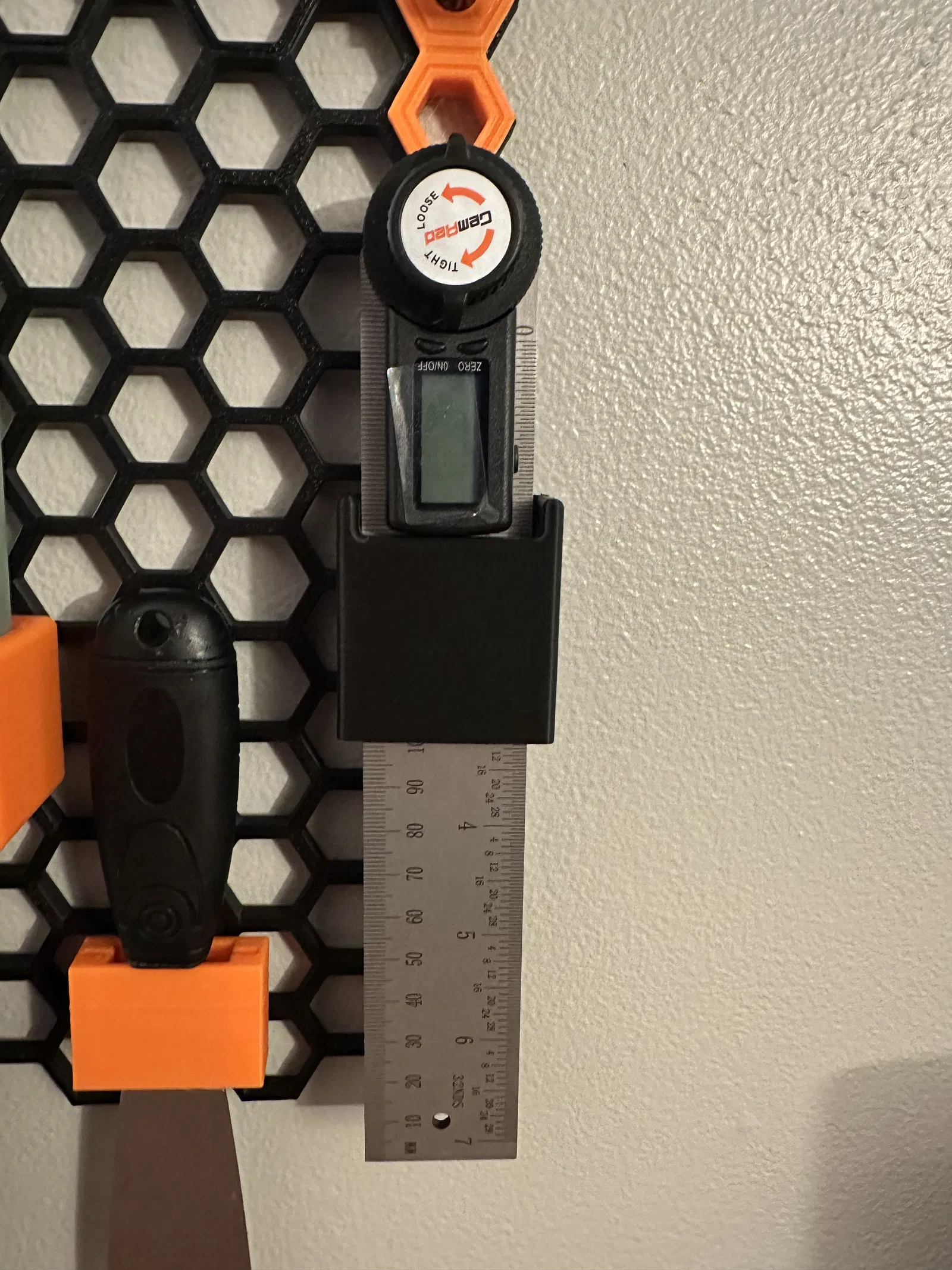 Phụ kiện giá đỡ Angle Finder cho hệ thống tường lưu trữ Honeycomb. Giúp bạn giữ chặt thiết bị đo góc Angle Finder một cách gọn gàng và dễ dàng truy cập trên tường lưu trữ Honeycomb của bạn. Thiết kế tối ưu cho các bộ phận in 3D.