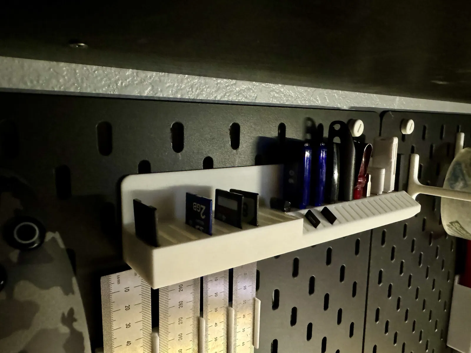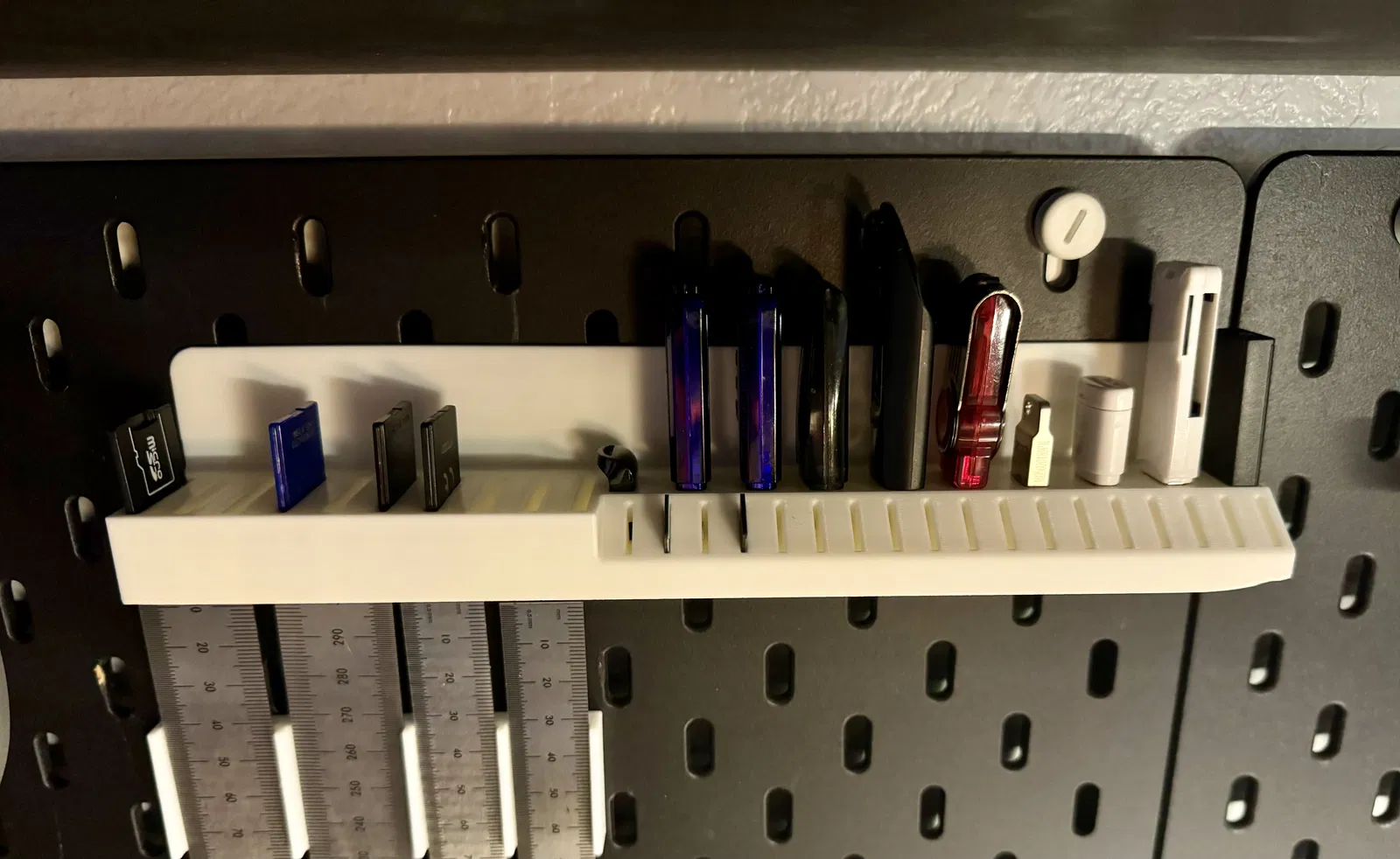 Kệ đựng USB, thẻ SD và MicroSD gắn cho bảng SKADIS của IKEA. Bản in này cần có hỗ trợ và có thể cần brim để tránh cong vênh. Phù hợp cho người dùng cần sắp xếp gọn gàng các loại thẻ nhớ và USB.