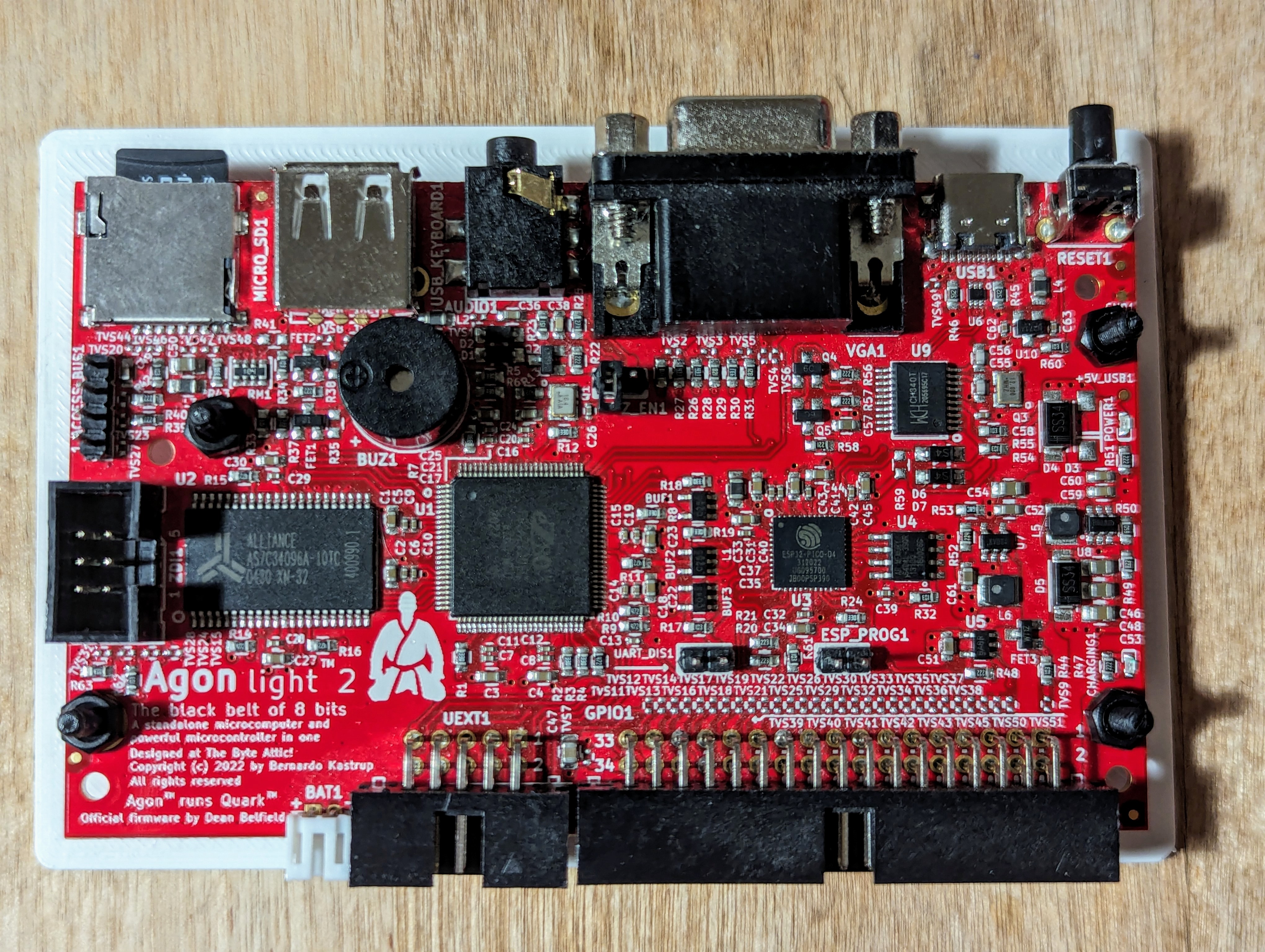 Đế máy tính 8-bit hiện đại AgonLight2. Dành cho phiên bản AgonLight2 của Olimex, máy tính này có mã nguồn mở hoàn toàn. Đế được in bằng PLA với lỗ vít M3.
