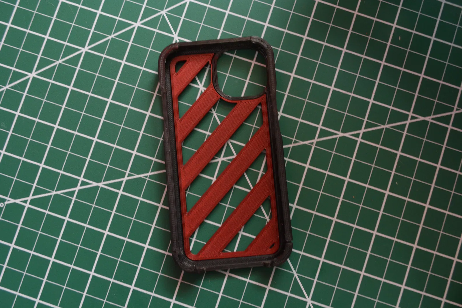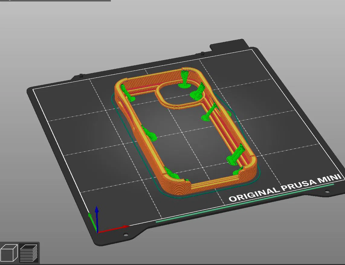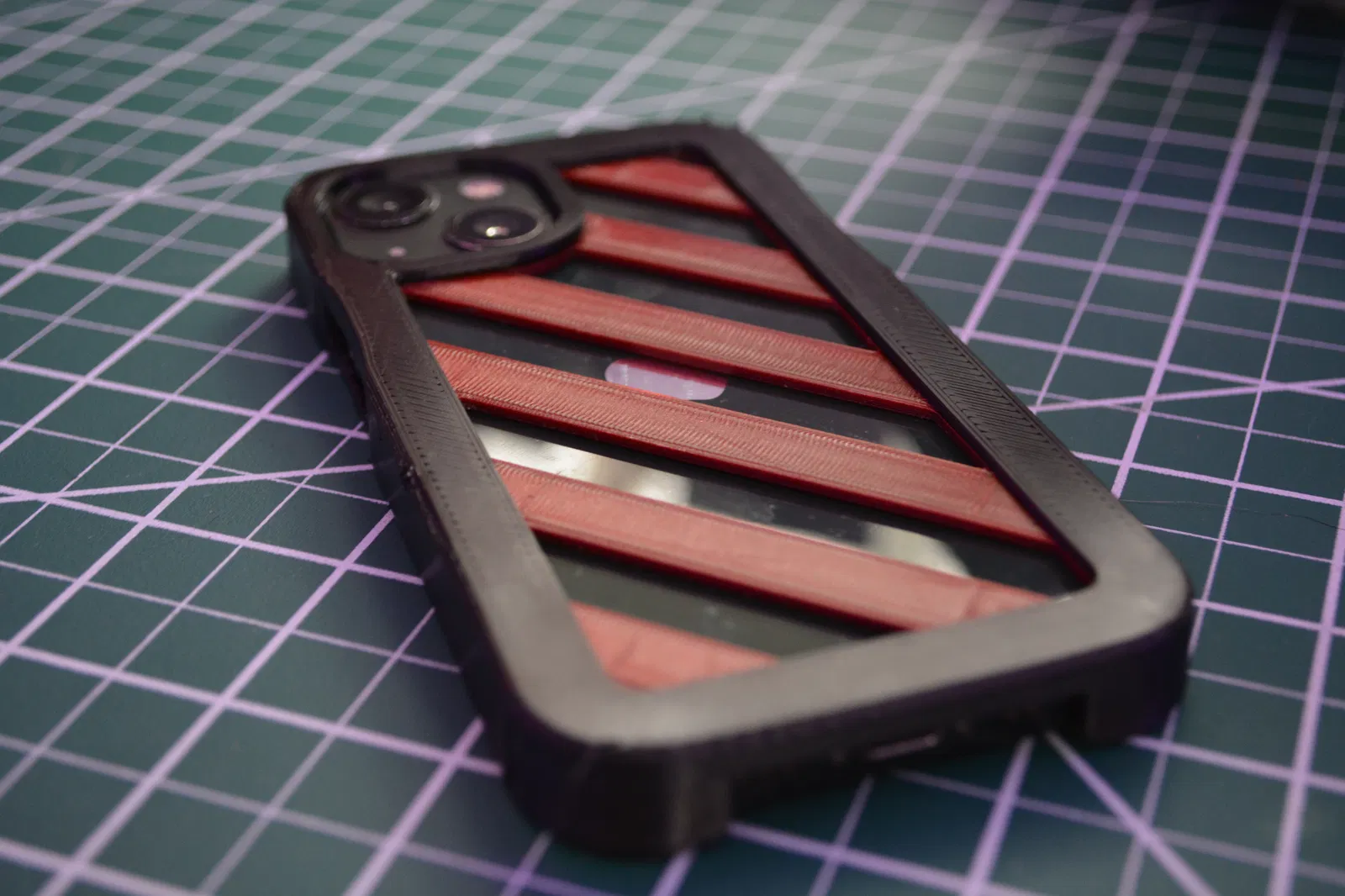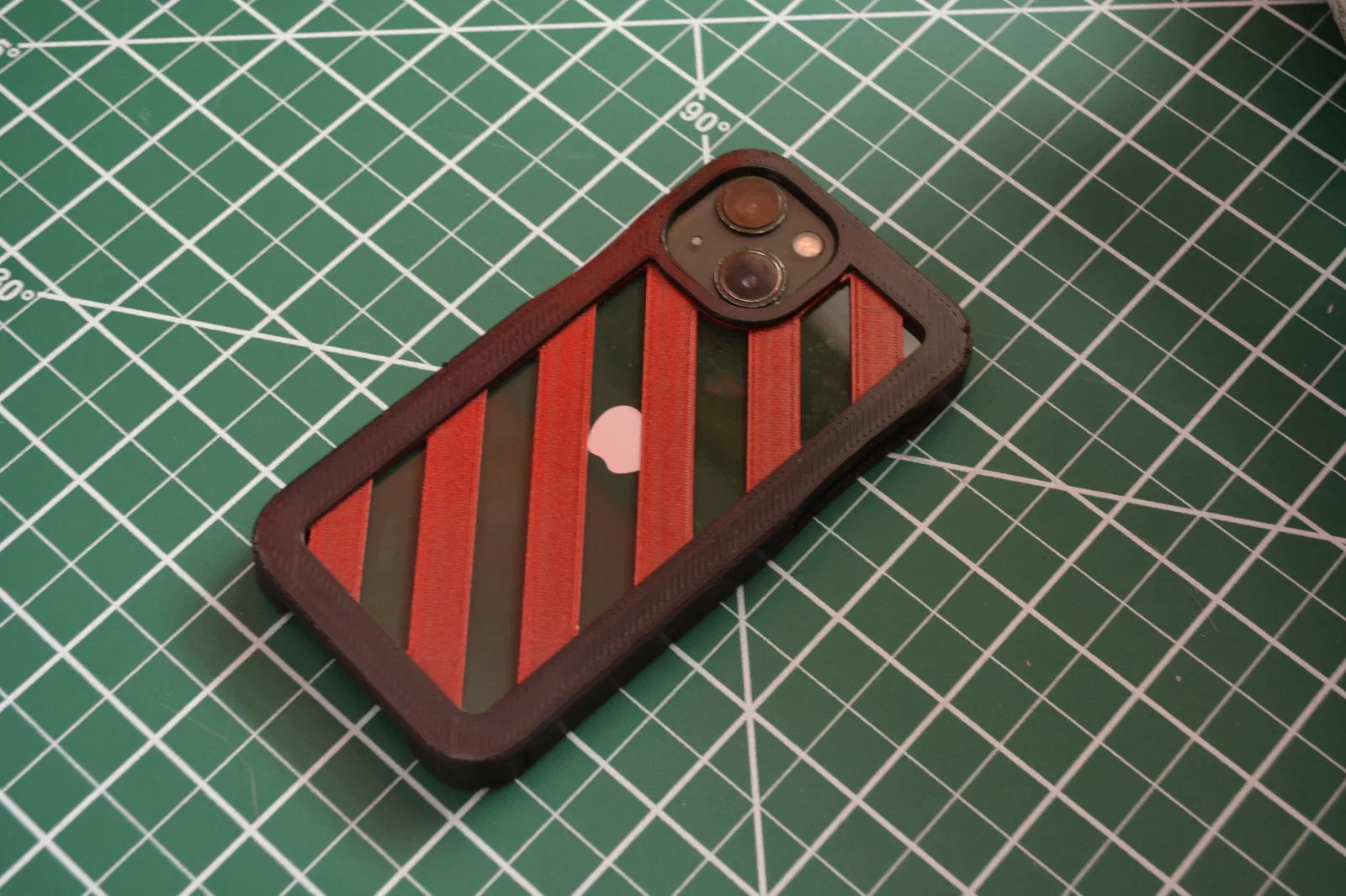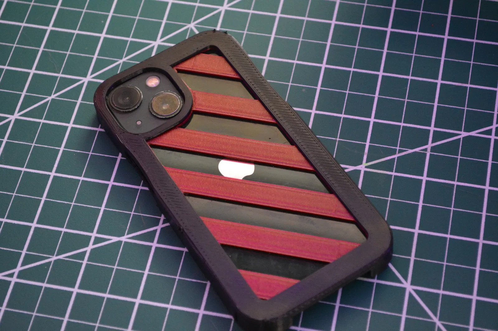 Đây là cái ốp lưng điện thoại iPhone 13 mini có thể tùy chỉnh được. May mắn là mình xài điện thoại màu xanh lá nên cái này hợp ghê. Phần đế in bằng TPU với nozzle 0.6 trên máy Prusa Mini. Mình khuyên bạn nên xài support cho phần viền ốp. Nếu bạn giật nó ra nhanh thì nó cũng không dính quá chặt đâu. Phần chèn ở trên là PLA và mình dùng sợi Proto-Pasta Heartthrob Red Metallic để in. Mình chưa thử in phần TPU bằng PLA, nhưng có mấy điểm gờ ở thành dưới. Mình có đính kèm file STEP và SLDPRT để bạn tùy chỉnh. Mình sẽ đăng một phiên bản khác tổng quát hơn sau nha.