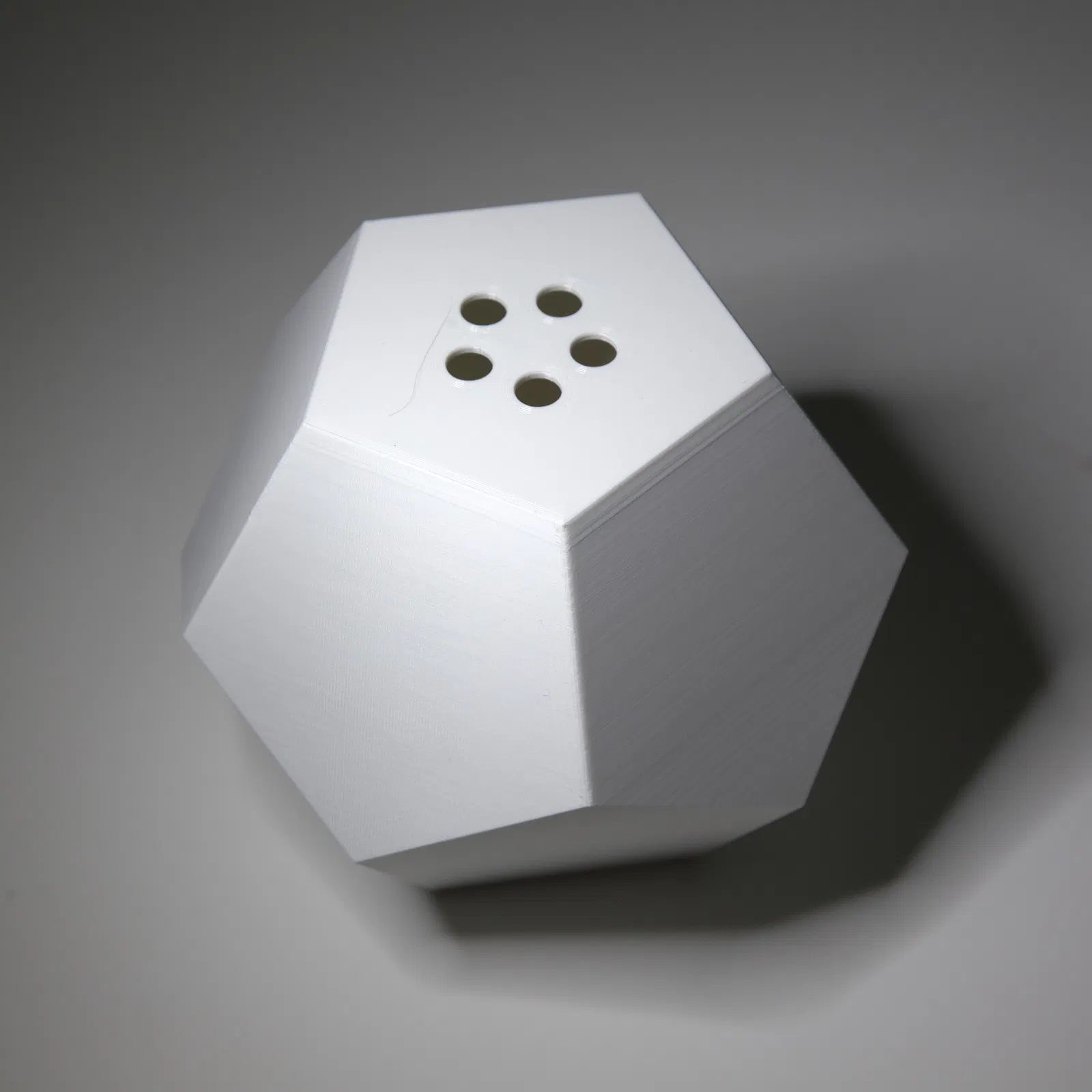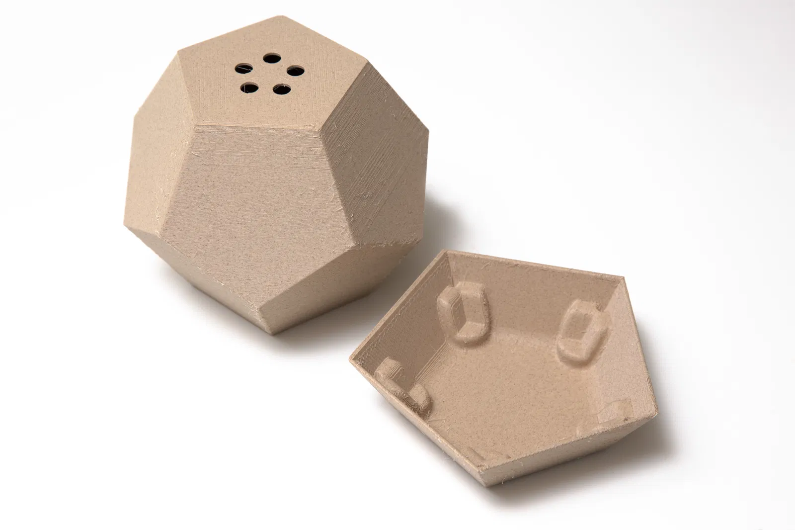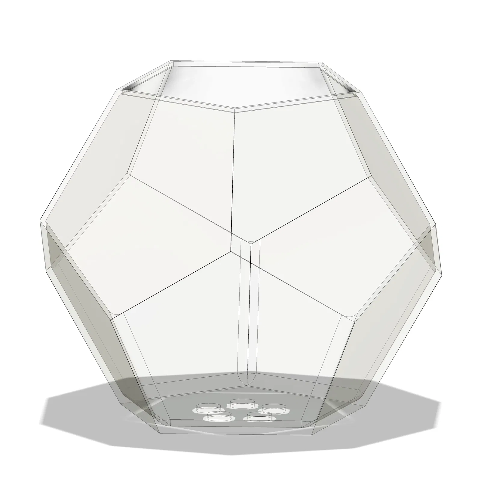 Chậu hoa hình khối 12 mặt (Dodecahedron) được hoàn thiện với đĩa hứng, hình ngũ giác. Nâng cao khỏi đĩa hứng. Lỗ thoát nước. Đĩa hứng có chân đế ba chân chống rung lắc. Các cạnh bên trong được bo tròn để dễ dàng vệ sinh và tăng độ bền. Có thể in 3D ở mọi kích thước.