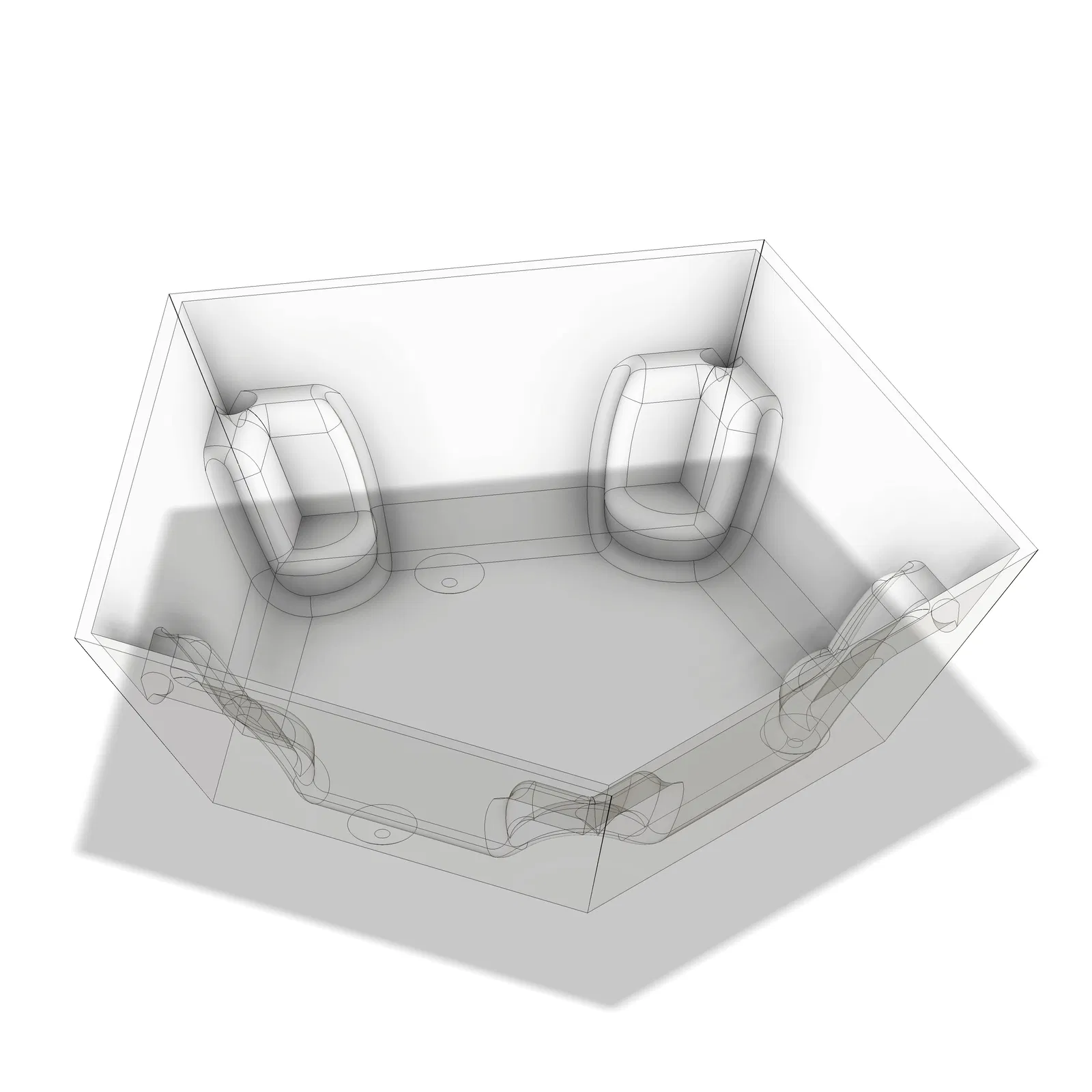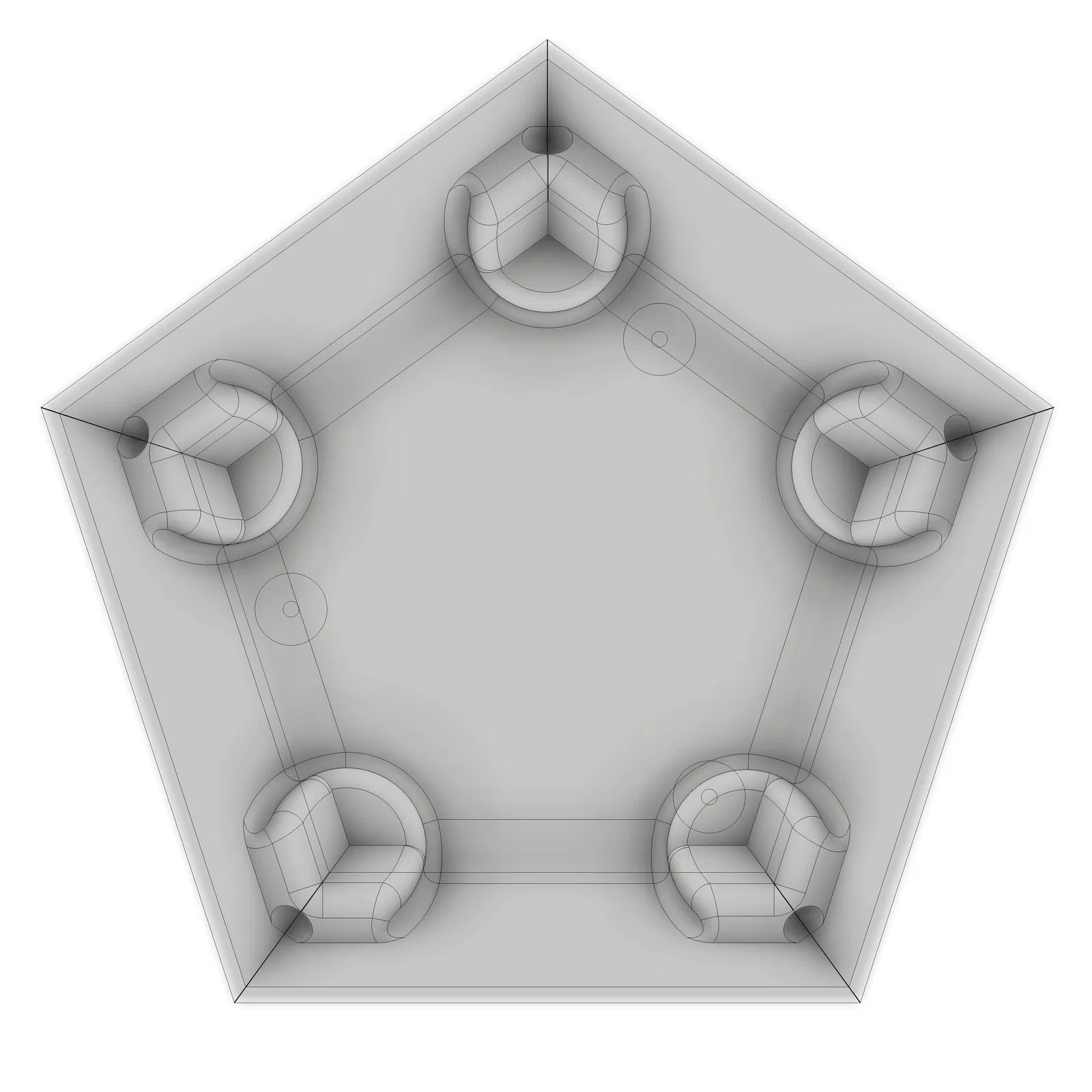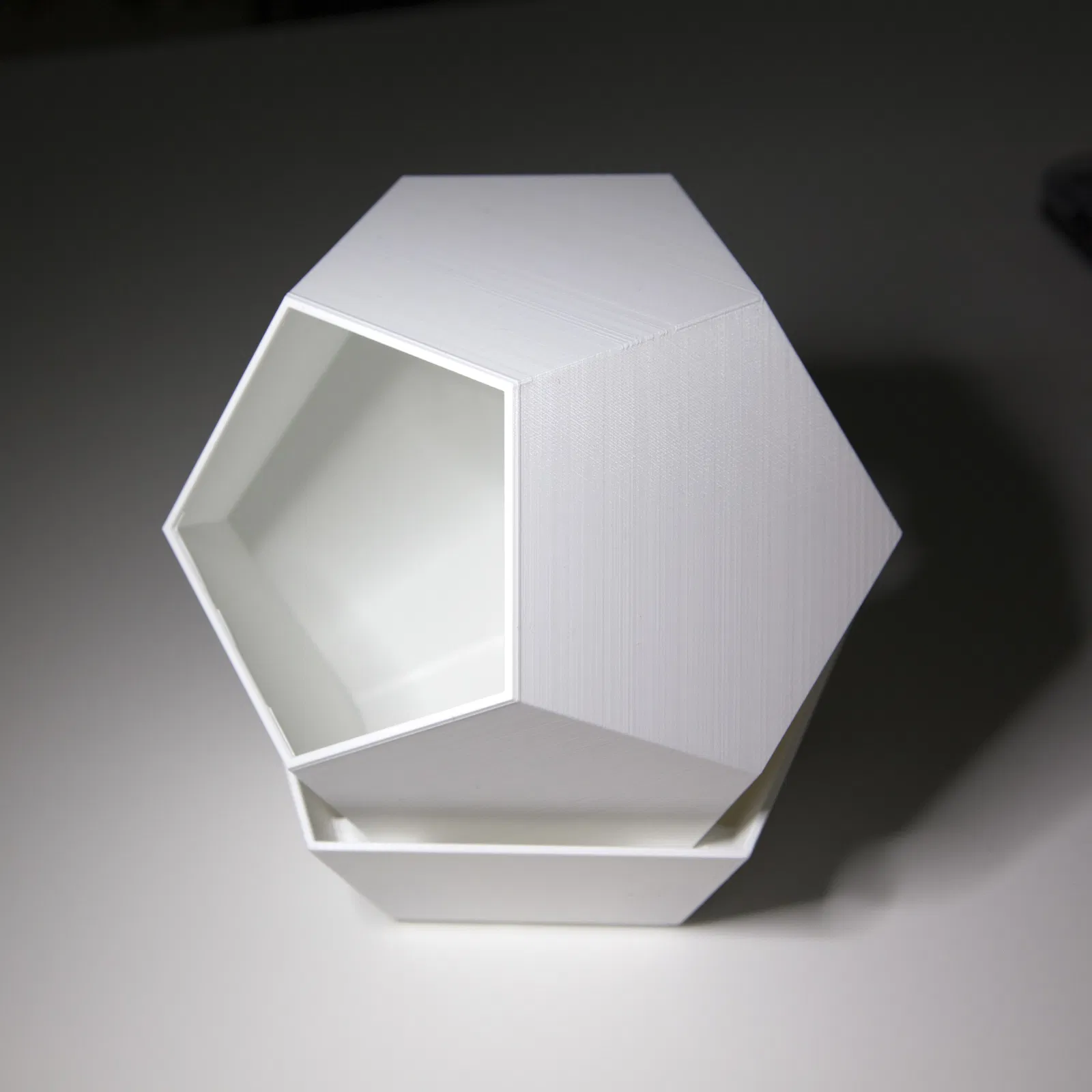 Chậu hoa hình khối 12 mặt (Dodecahedron) được hoàn thiện với đĩa hứng, hình ngũ giác. Nâng cao khỏi đĩa hứng. Lỗ thoát nước. Đĩa hứng có chân đế ba chân chống rung lắc. Các cạnh bên trong được bo tròn để dễ dàng vệ sinh và tăng độ bền. Có thể in 3D ở mọi kích thước.