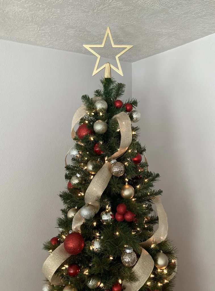 Đây là một cái đỉnh cây thông Noel cực kỳ đơn giản. Không cần in kèm giá đỡ. In 2 cái rồi dán chúng lại với nhau. Cái này ban đầu được thiết kế cho cây thông Noel nhỏ hơn. Cây thông trong ảnh là cây thông cao 7 foot loại slim và cái ngôi sao đã được chỉnh kích thước cho vừa. Ngôi sao được phóng to lên 228mm theo trục X (nhớ dùng chế độ chỉnh kích thước đồng nhất nha).