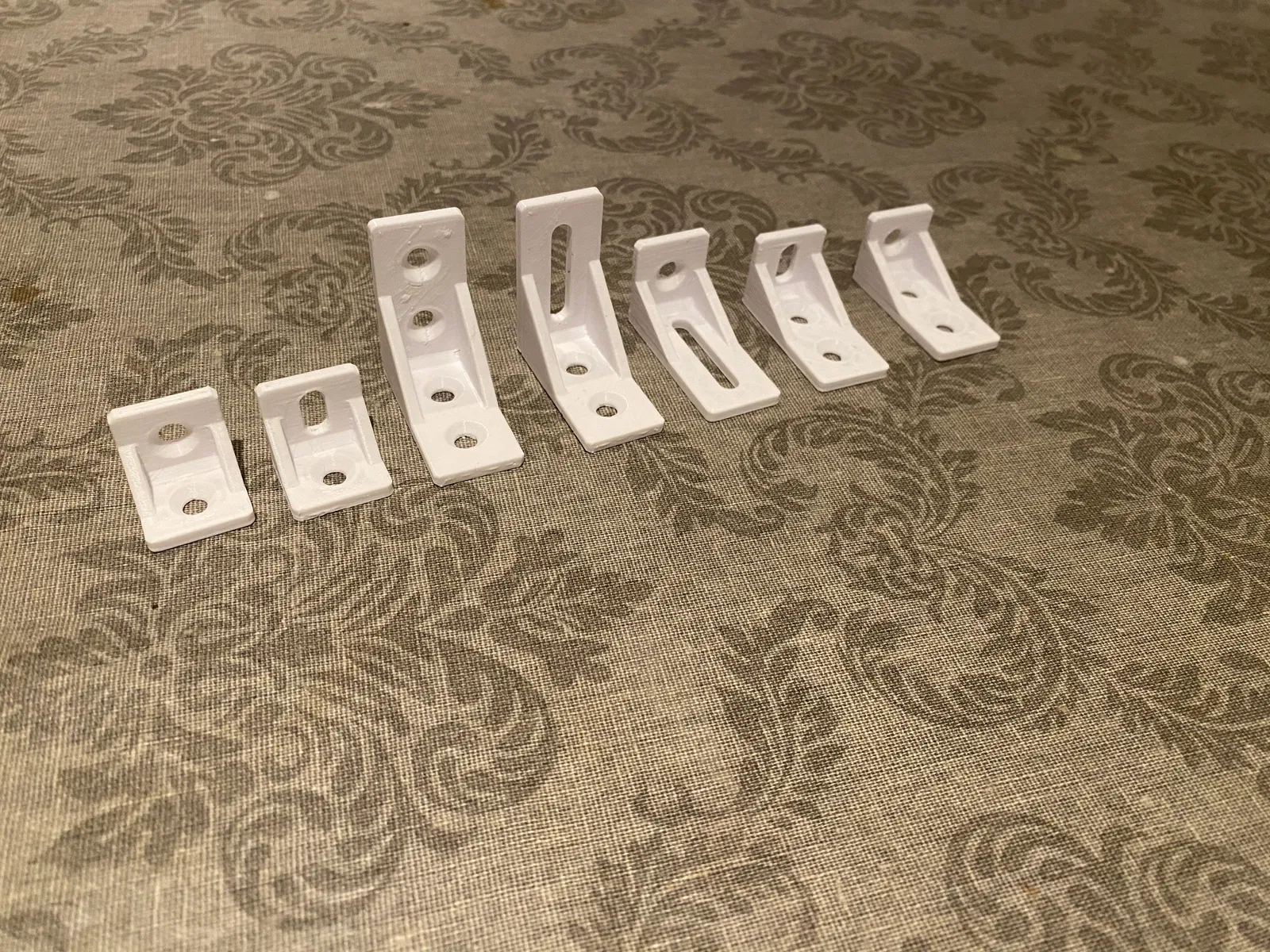 Gói phụ kiện này bao gồm nhiều loại ke góc chữ L và ke góc vuông với các kích thước và độ dày khác nhau (3mm và 6mm). Có cả phiên bản cho góc trong và góc ngoài, lỗ bắt vít 5mm có lỗ khoét chìm 2mm. Phù hợp cho các công việc DIY, mộc, cải tạo nhà cửa. Nên in thử trước khi sử dụng.