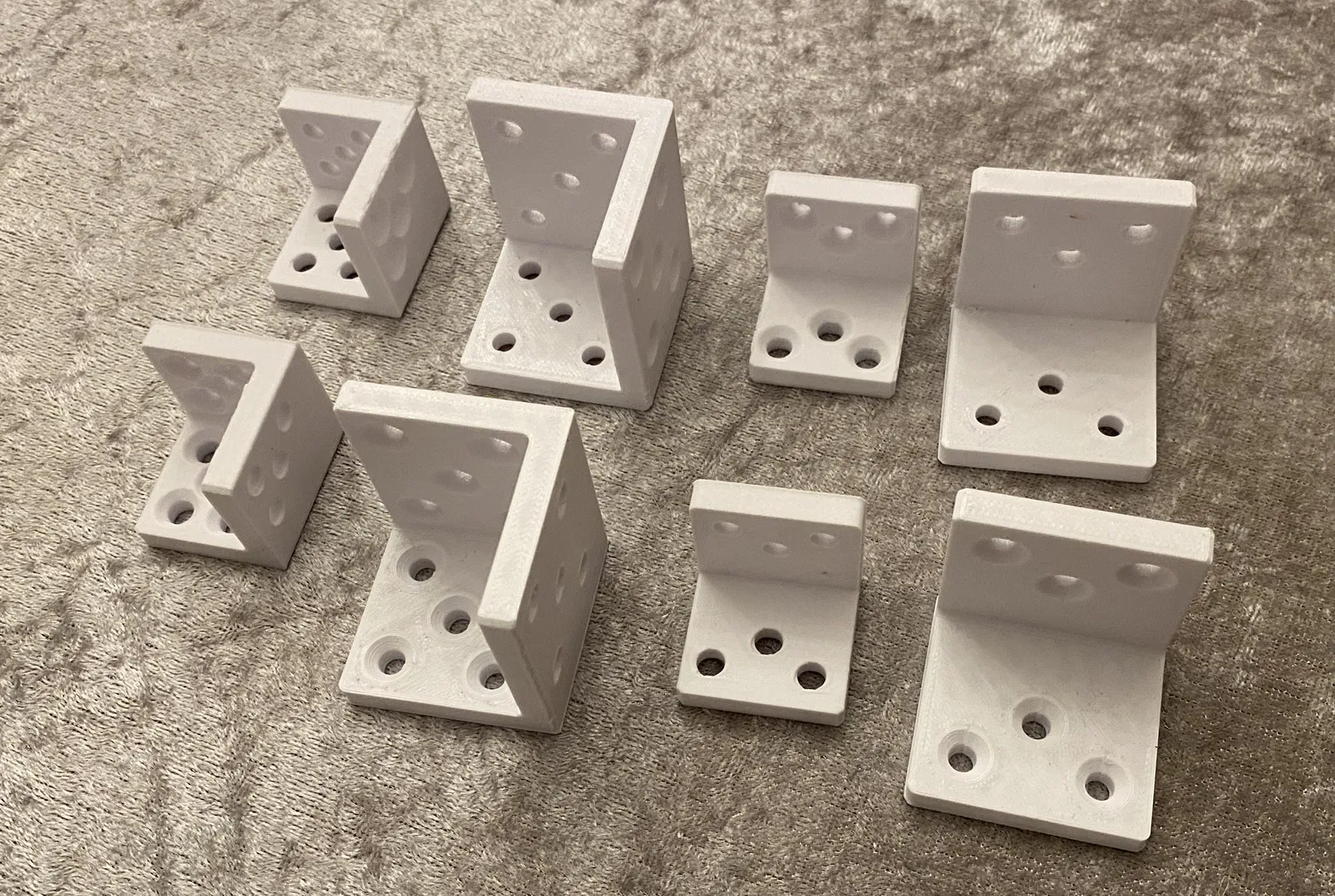 Tui làm cái gói phụ kiện này để mấy anh em có thể tự in khi cần xài. Có đủ loại ke góc chữ L (L-bracket) và ke góc vuông (corner brace), cả loại cho góc trong lẫn góc ngoài luôn.