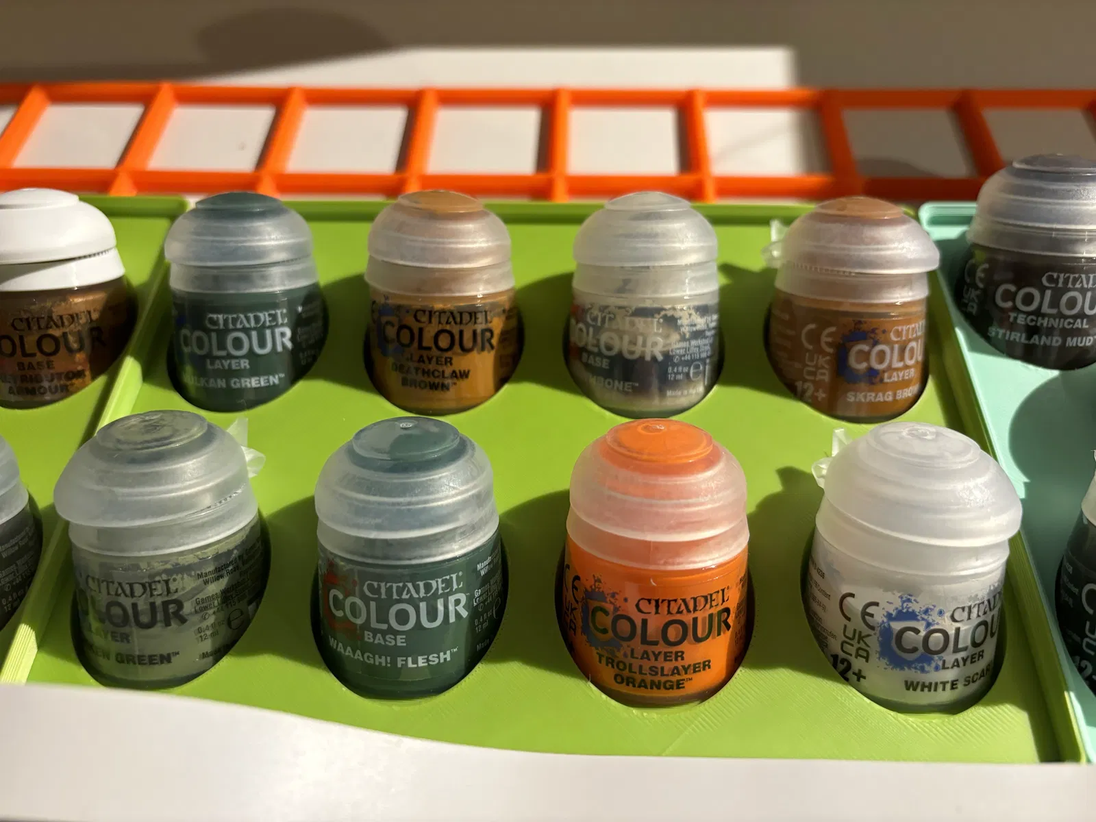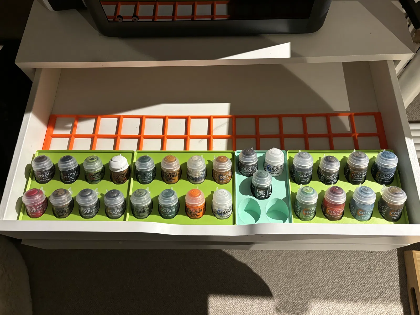 Chỗ để sơn miniature dễ xem, biết rõ còn/hết sơn nào. Khay nghiêng giúp đọc tên sơn dễ hơn, tương thích Gridfinity. Kích thước đa dạng từ 1-4 ô rộng.