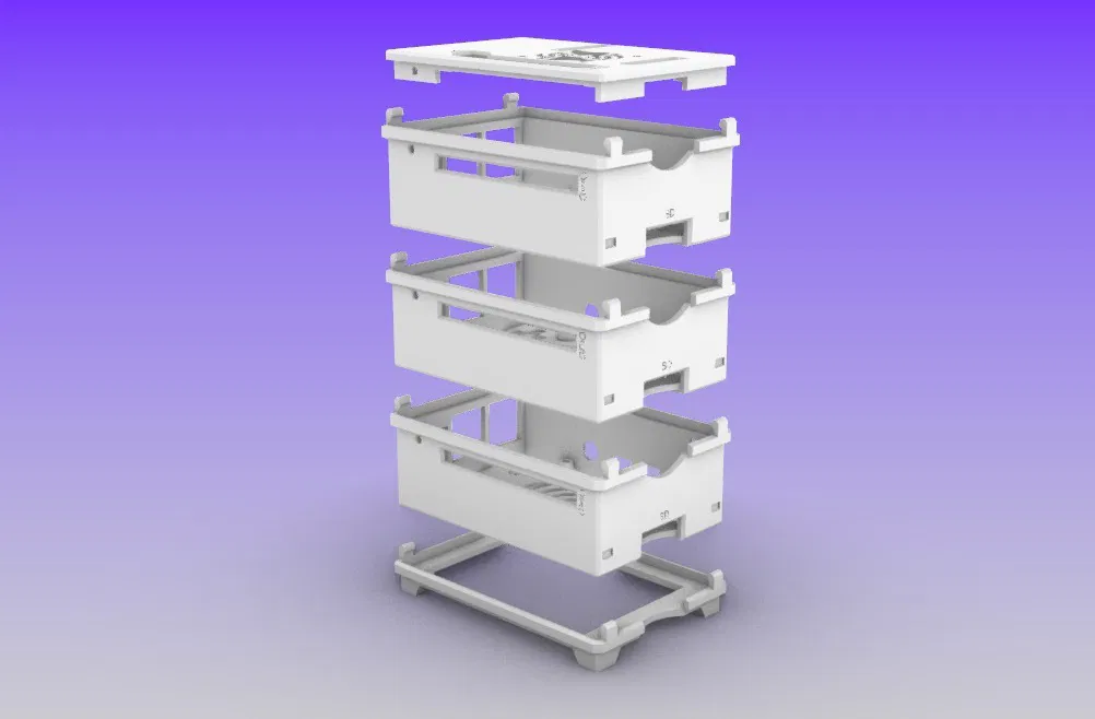 Đây là một vỏ case cho Raspberry Pi 4 cho phép bạn xếp chồng tùy ý số lượng vỏ case lên nhau để xây dựng cluster raspberry pi. Hình thu nhỏ cho thấy 3 cái nhưng bạn có thể xếp cao tùy thích. Mỗi phần giữa sẽ khớp với phần trên và dưới. Khi bạn xếp xong, hãy thêm phần trên và dưới cùng cho chồng. Nói rõ ràng: Bạn in bao nhiêu phần giữa tùy thích, và đóng gói chồng đó bằng một phần trên và một phần dưới duy nhất.