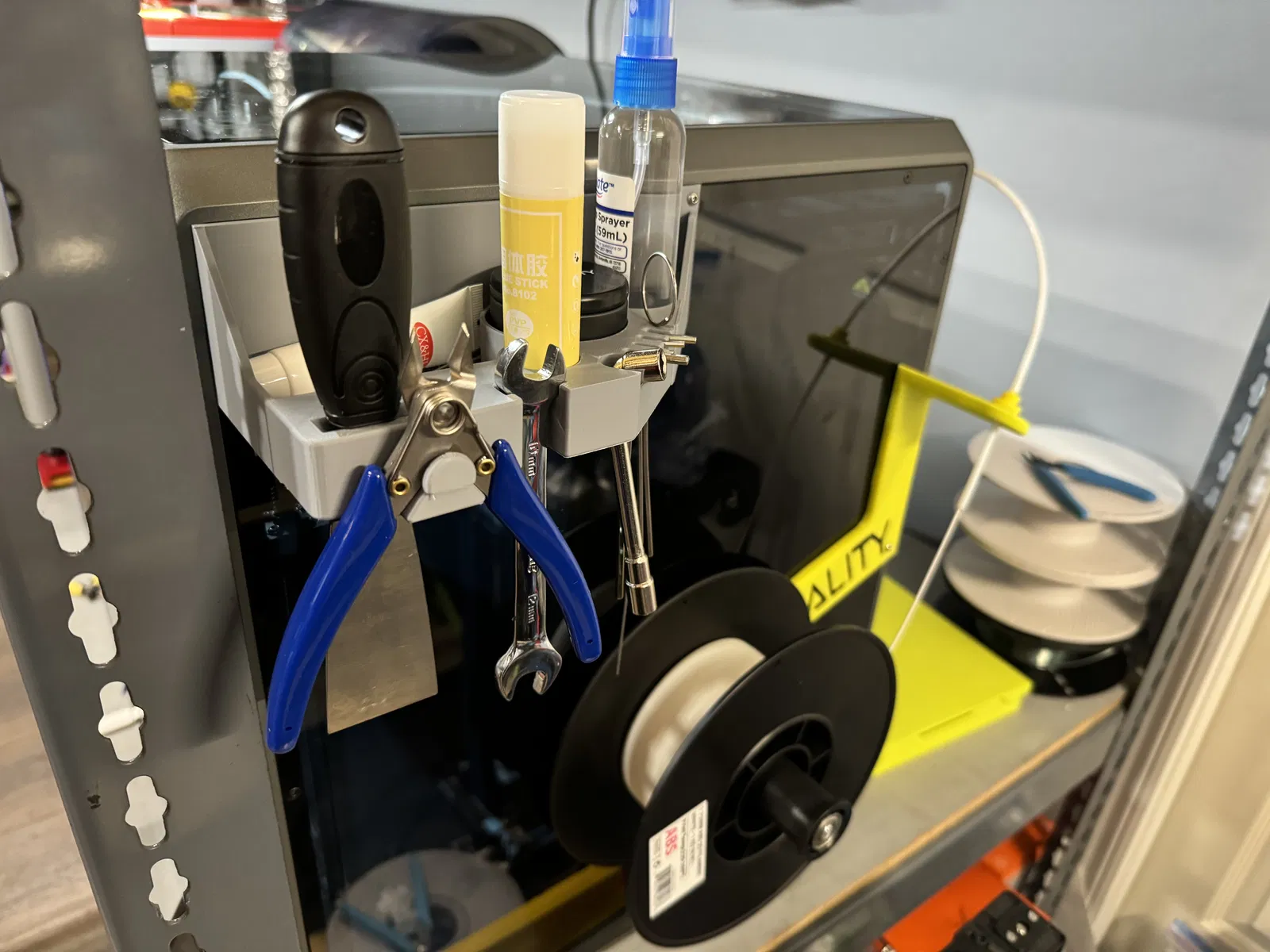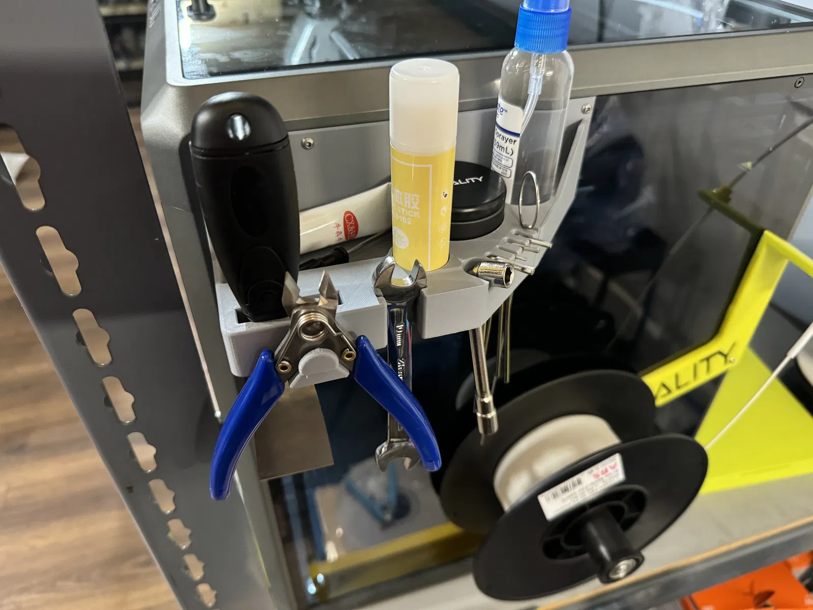 Giá đỡ dụng cụ gắn bên hông cho K1 Max, giúp bạn cất giữ mọi dụng cụ, hộp thiếc đựng đầu phun và cả bình xịt một cách gọn gàng. Thiết kế tối ưu không gian cho máy in 3D Creality K1 Max của bạn.