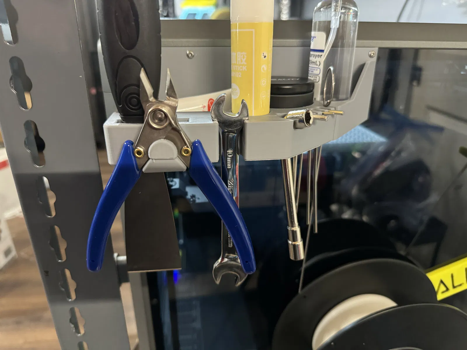 Muốn có một cái kẹp giữ dụng cụ gắn cố định trên K1 Max. Nó giữ được tất cả các dụng cụ, cái hộp thiếc tròn đựng đầu phun đi kèm và thêm cả chỗ để bình xịt nữa.